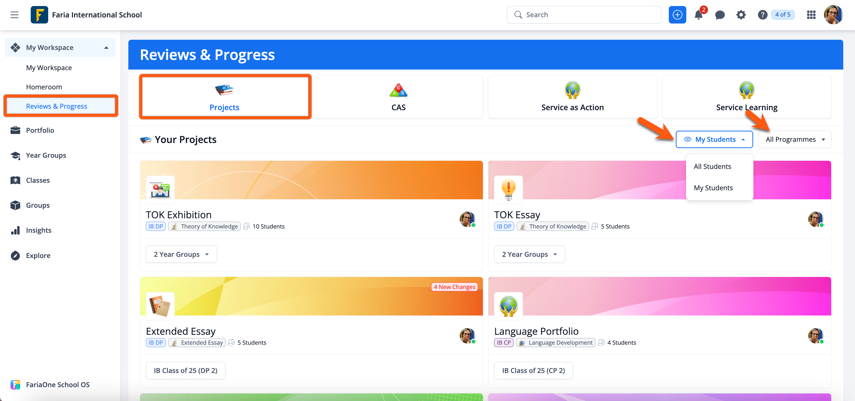 Via Reviews & Progress > Projects, EE & TOK tab