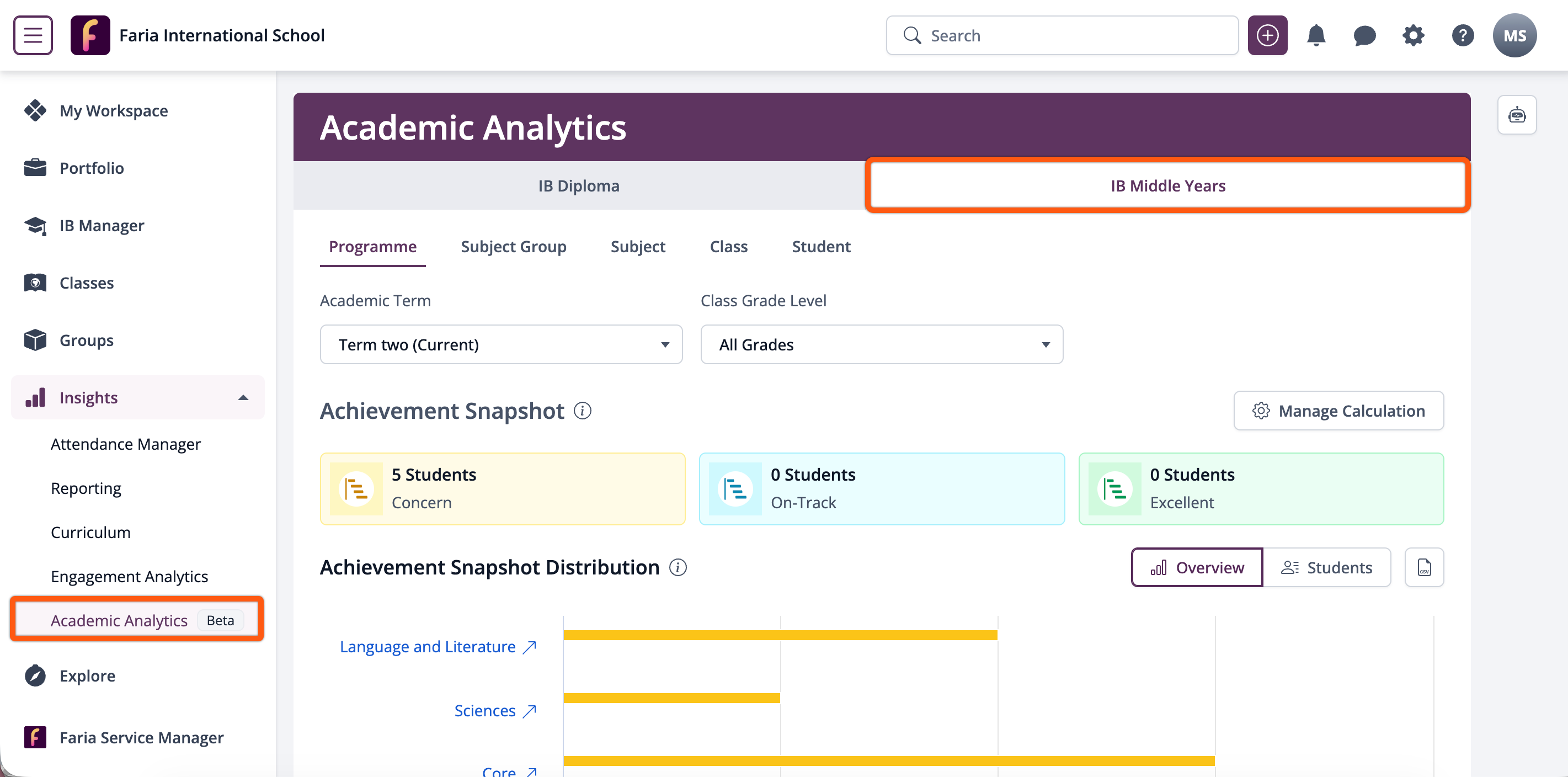 ManageBac+ Academic Analytics now serves all MYP students and coordinators with the same navigation model, depth, and decision-making tools as DP, purpose-built for MYP's assessment and curriculum structure. It gives school leaders, coordinators, teachers, and support teams a single, coherent view of academic performance, enabling faster, more confident decisions that are grounded in MYP-aligned evidence.