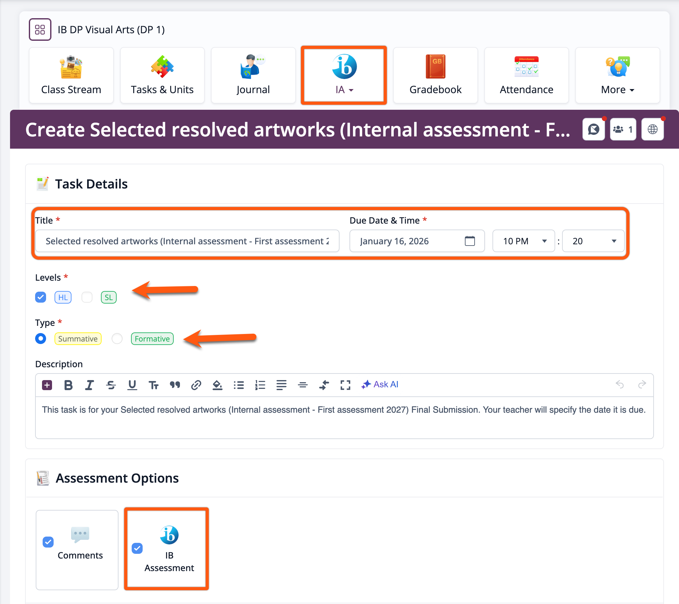 When first opening the IA page of a Arts class, teachers will see the configuration page to create the First Assessment IA tasks.