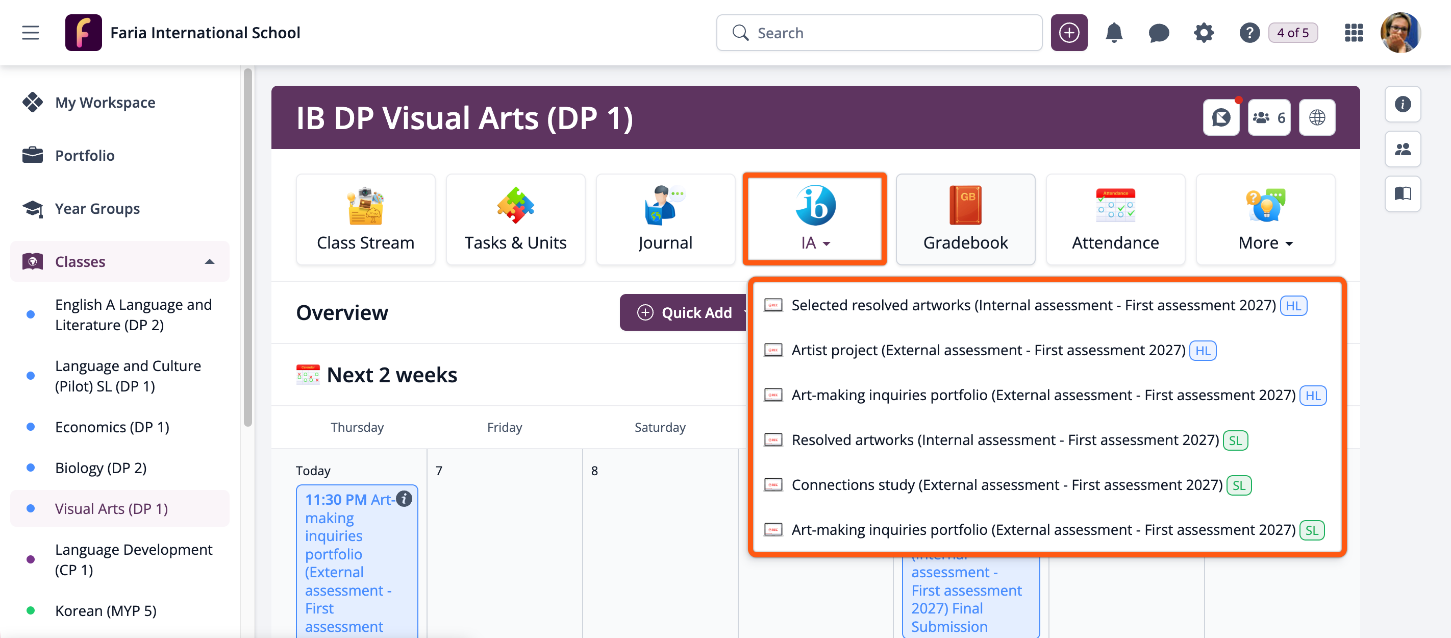 Certain subjects in the IB DP Group 6 subject group have an Interactions component. ManageBac+ shows an extra Interactions tab in classes linked to these subjects.