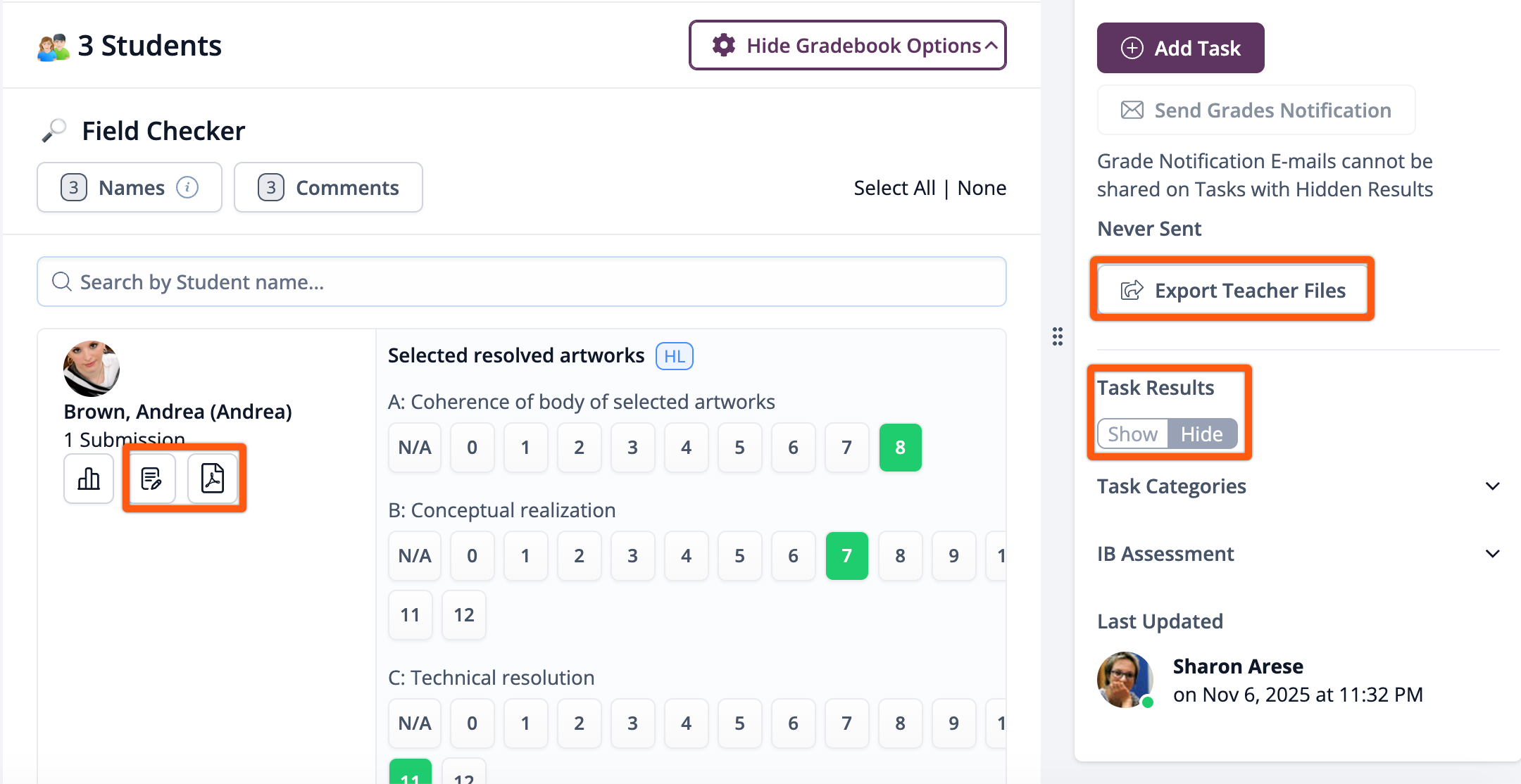 Teachers can also export all Teacher Comments and Criteria PDF in bulk for the Task from the right sidebar by clicking Export Teacher Files.