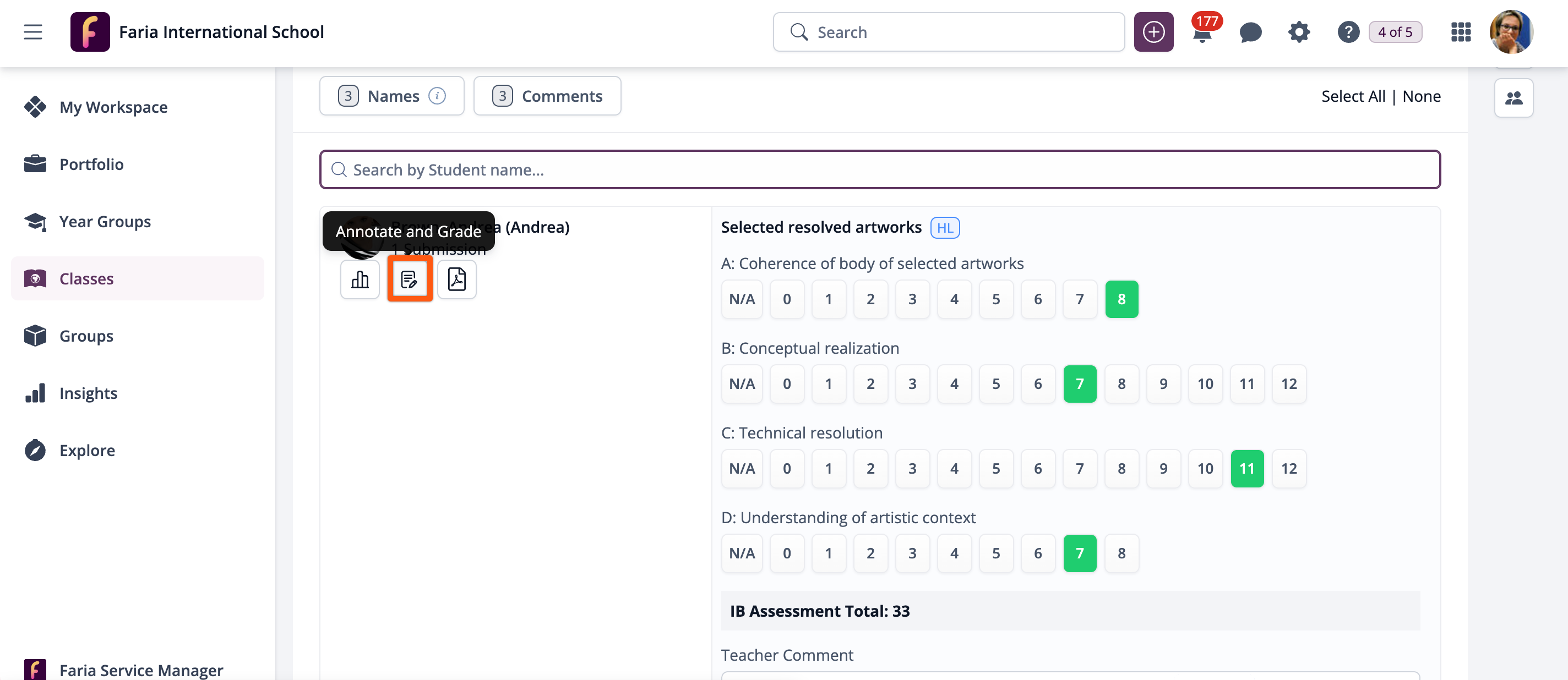 Teachers have two ways to assess the student submission for the IA Tasks. They can either enter Criteria marks and Comments in the Gradebook section of the Task via the IA page. Or they can open the Annotate and Grade view of the submission and then grade the submission that way.