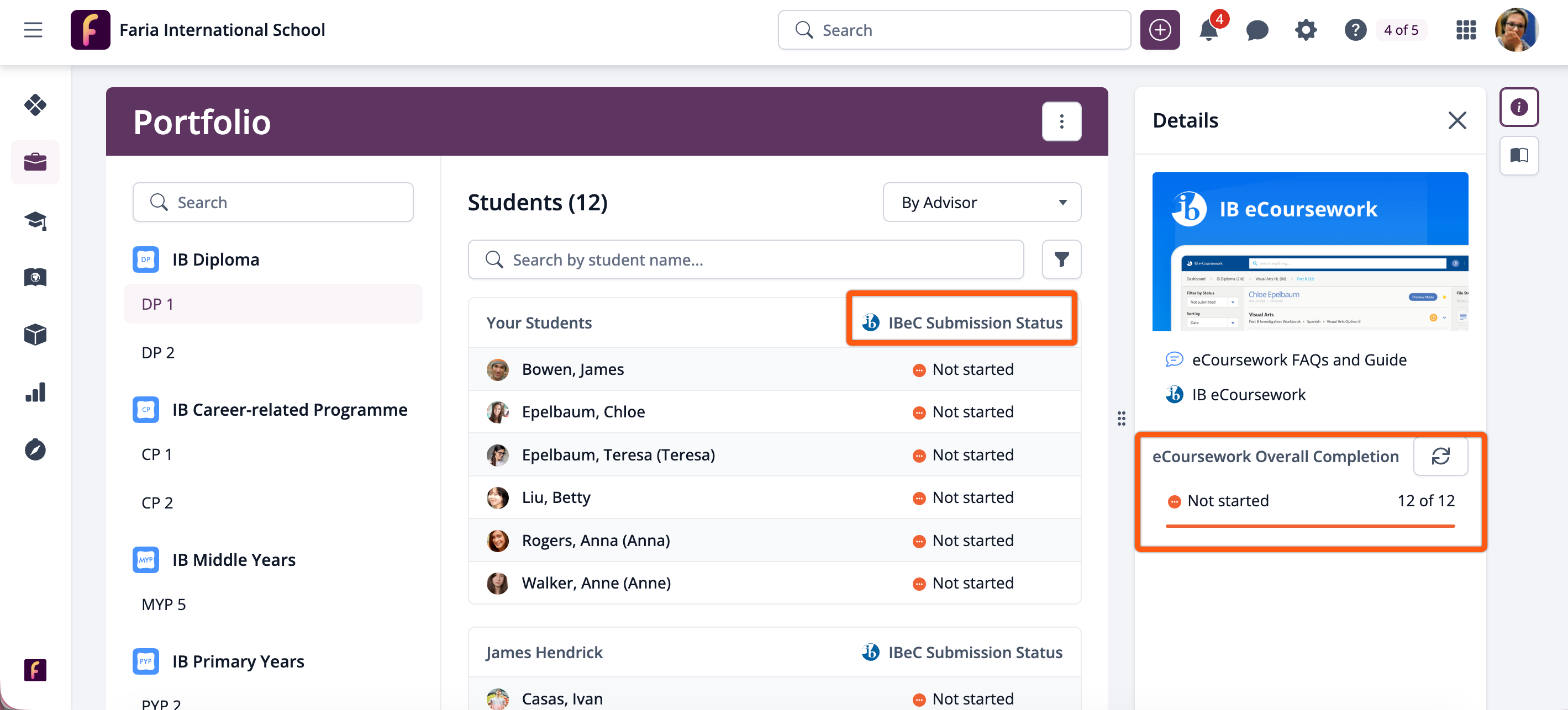 Advisors & Administrators can track Live Status of IB eCoursework Overall Completion via the Portfolio Roster. The right-hand side provides a summary of student progress, with individual statuses included in the roster list