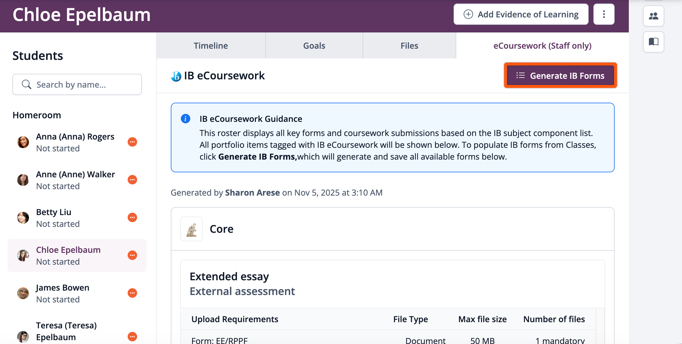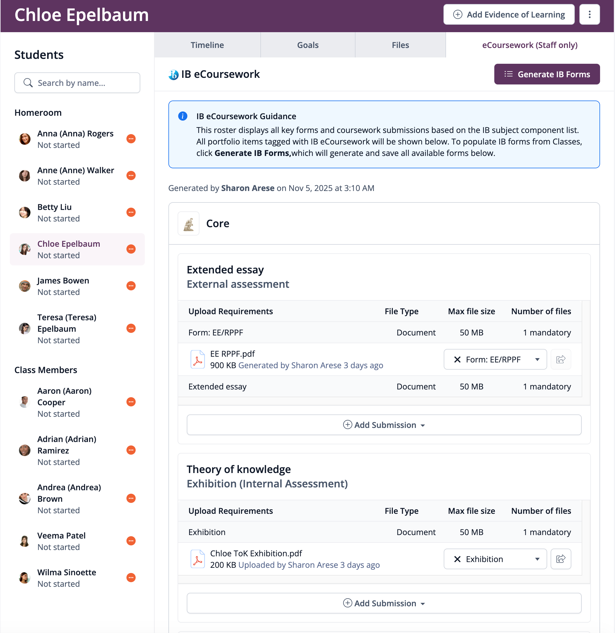 For Scenario A Existing ManageBac+ schools who are using Classes & Year Groups, you'll find a Generate IB Forms button in the student Portfolio > eCoursework page, which exports all the IB forms built-in to your ManageBac+ account, exportable and pre-filled with student data.