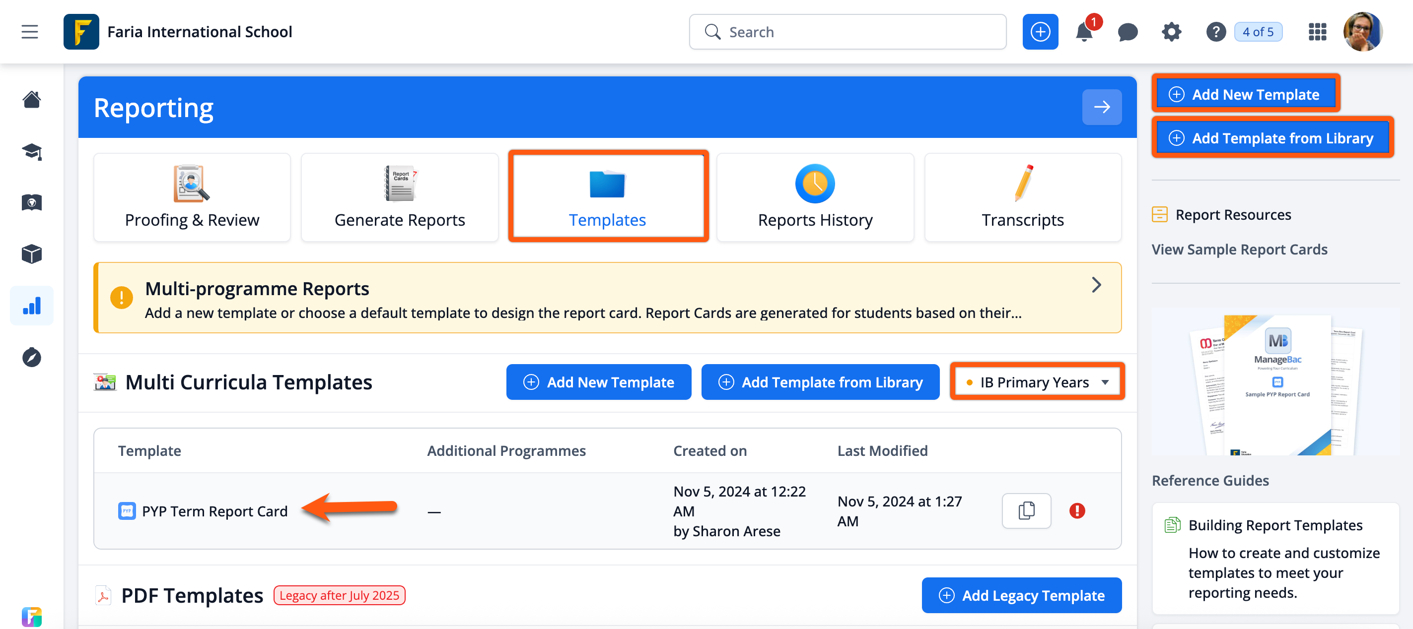 Via Reporting > Templates > IB Primary Years