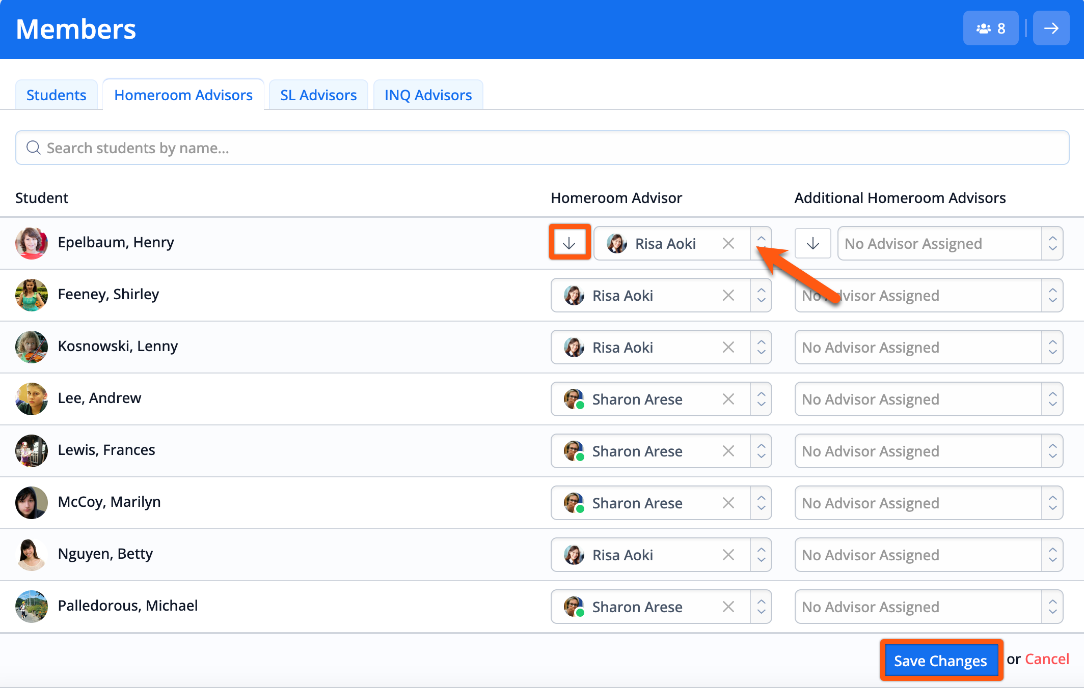 Via the student's profile > Edit Profile, you will be select the advisor from the Homeroom Advisor dropdown.