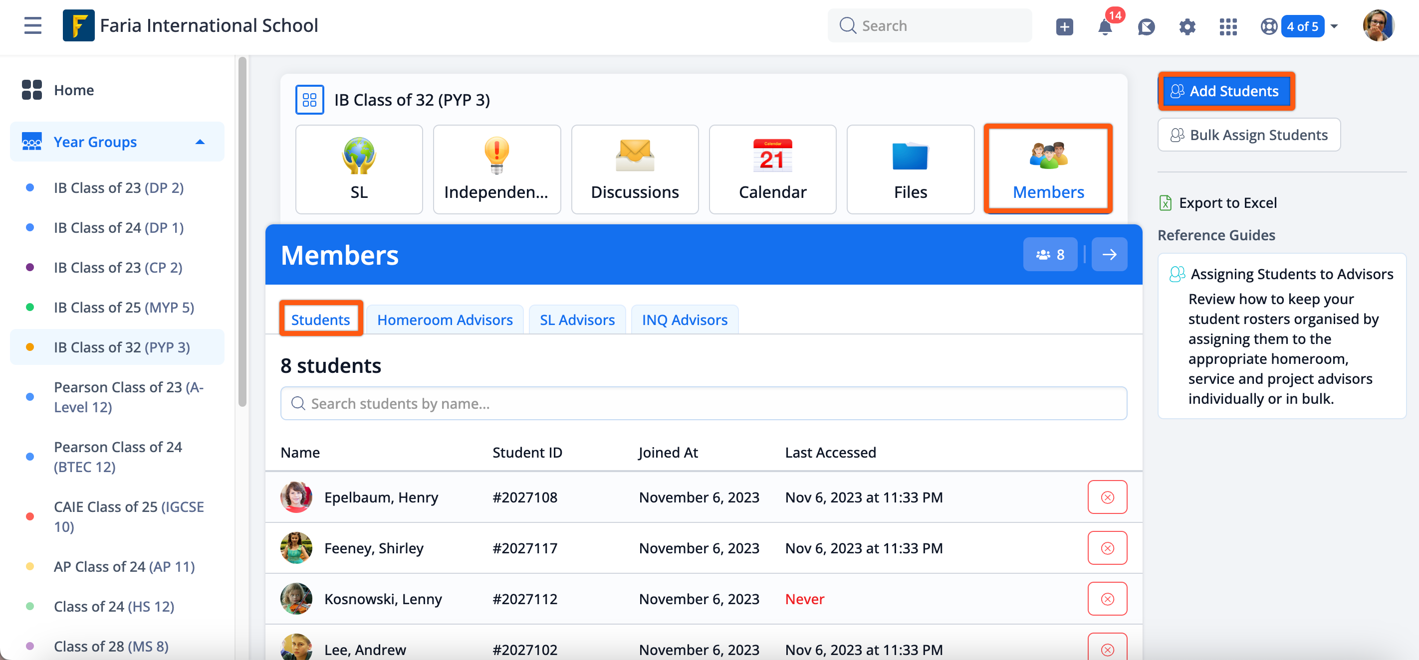 Navigate to the Year Group's Members > Students > Bulk Assign Students.