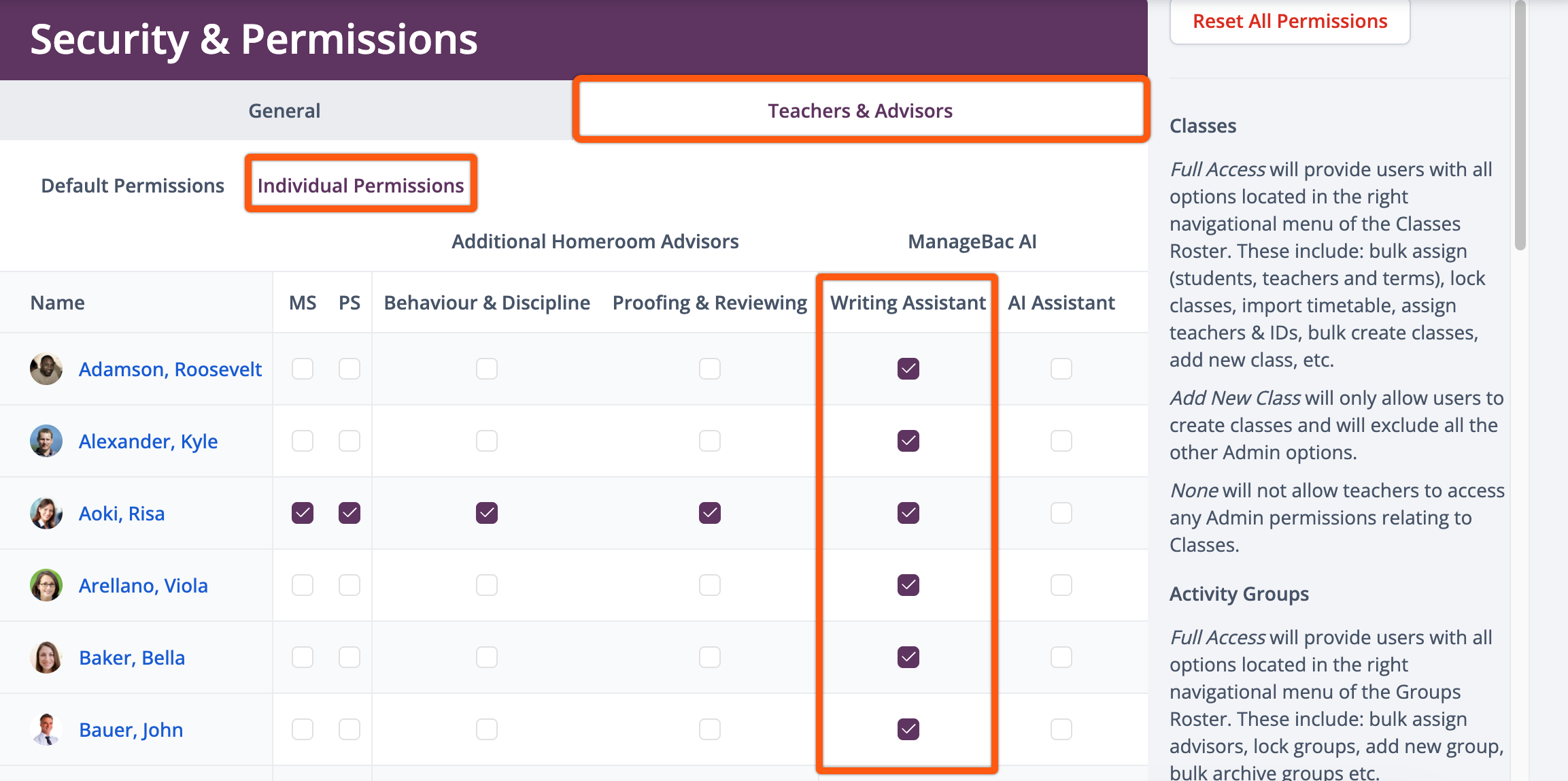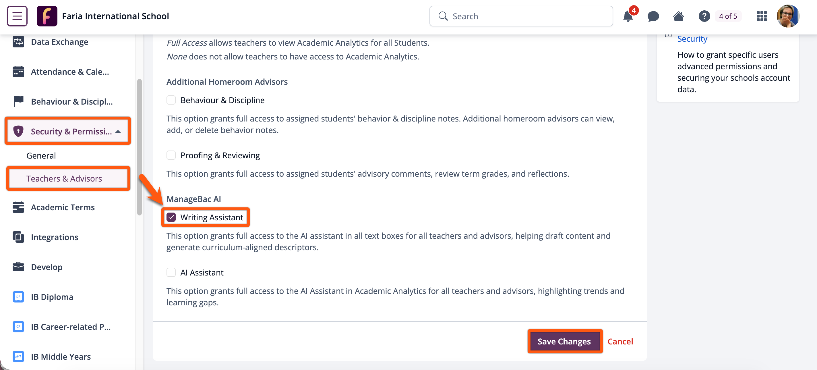 Enabling ManageBac+ AI: Writing Assistant Permission for Teacher & Advisor Users
