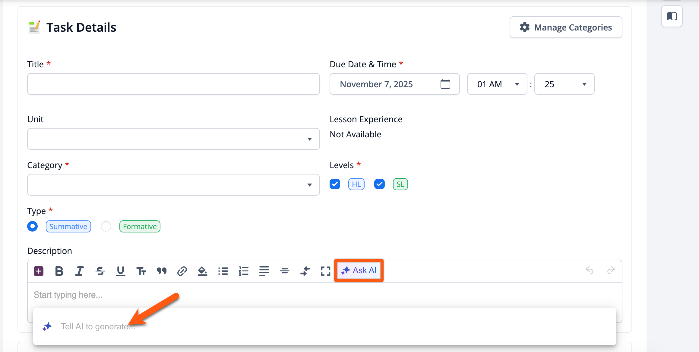 Once ManageBac+ AI: Writing Assistant is enabled, users will be able to see the Ask AI feature showing in any Rich Text Editor in their ManageBac+ account. There are two ways of using the Writing Assistant feature: