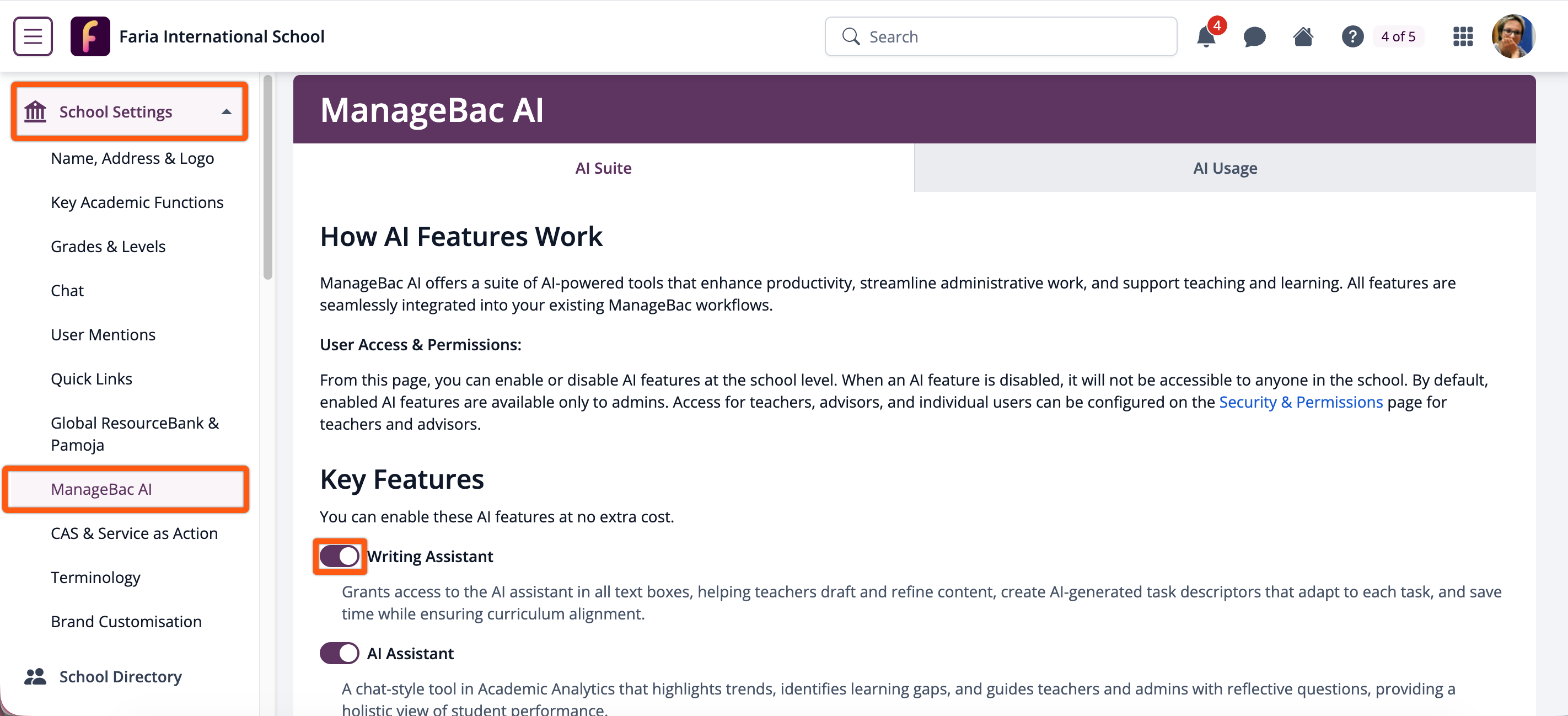 Enabling ManageBac+ AI: Writing Assistant for the School