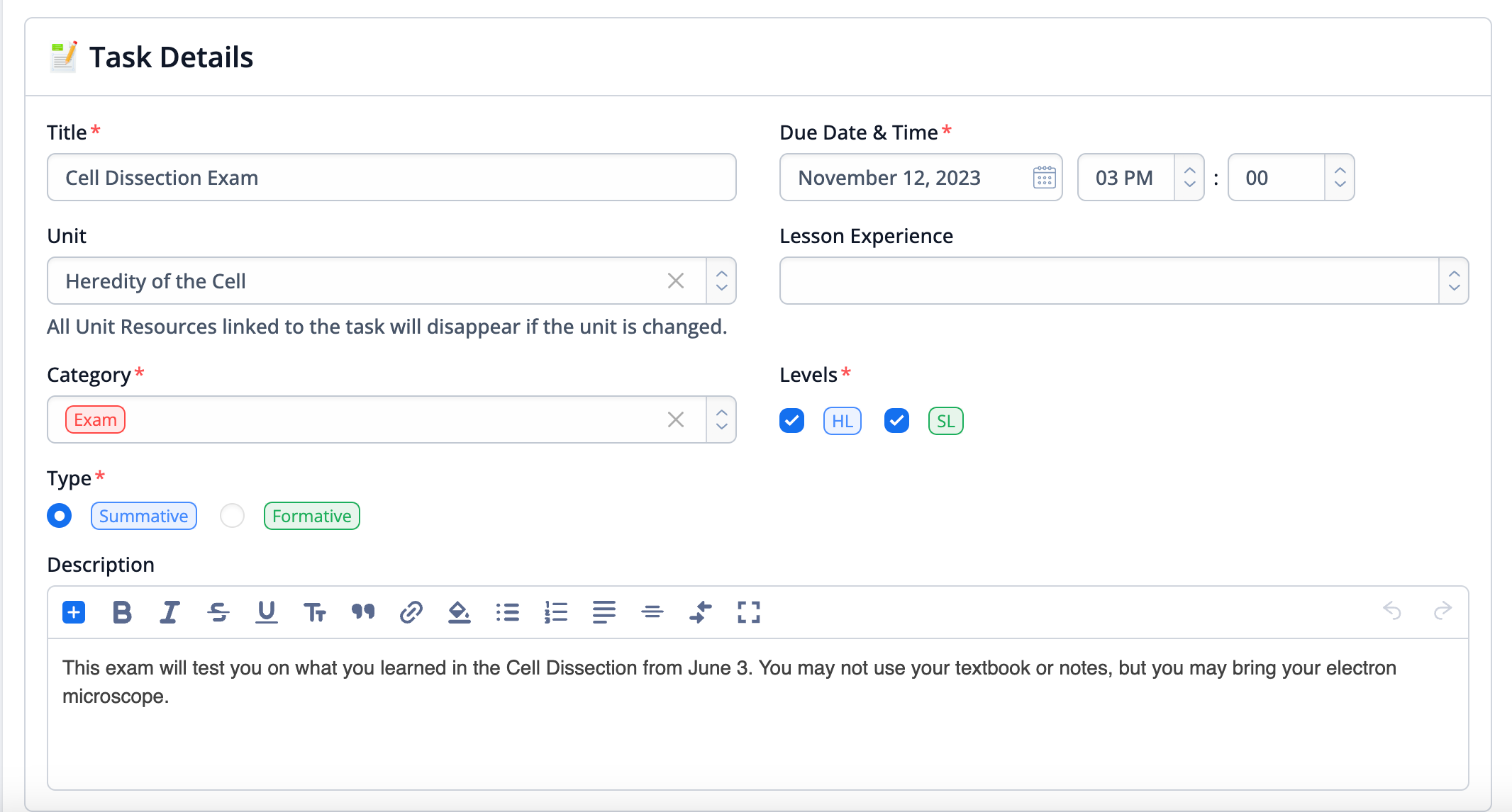 Teachers can choose which group of students the task (online assessment in this case) is assigned to. This can be selected in the Student Differentiation section. They can choose to assign it based on the students’ level (HL or SL for IB DP for example) or they can choose a specific set of students to which to assign the task.