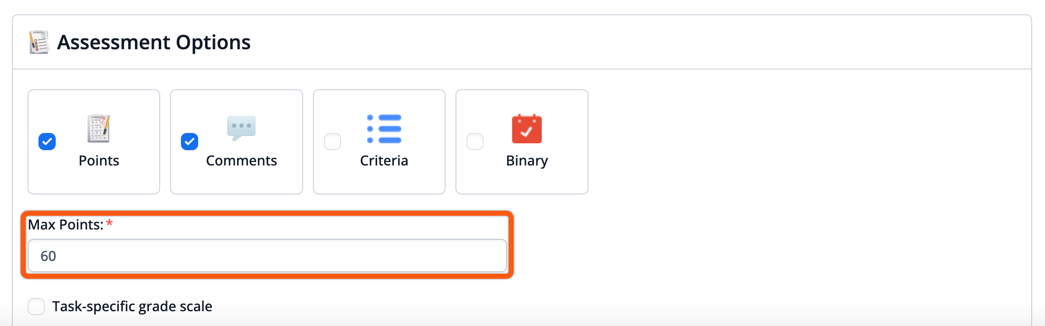 Comments Only Assessment mode is not supported currently. The relevant assessment options will be highlighted in AP colour and logo. If the "Comments Only" mode is selected, then you would not be able to create or save the task and it would display an error "AssessPrep assessments can't be blank". To rectify this issue, Click on the highlighted assessment options.