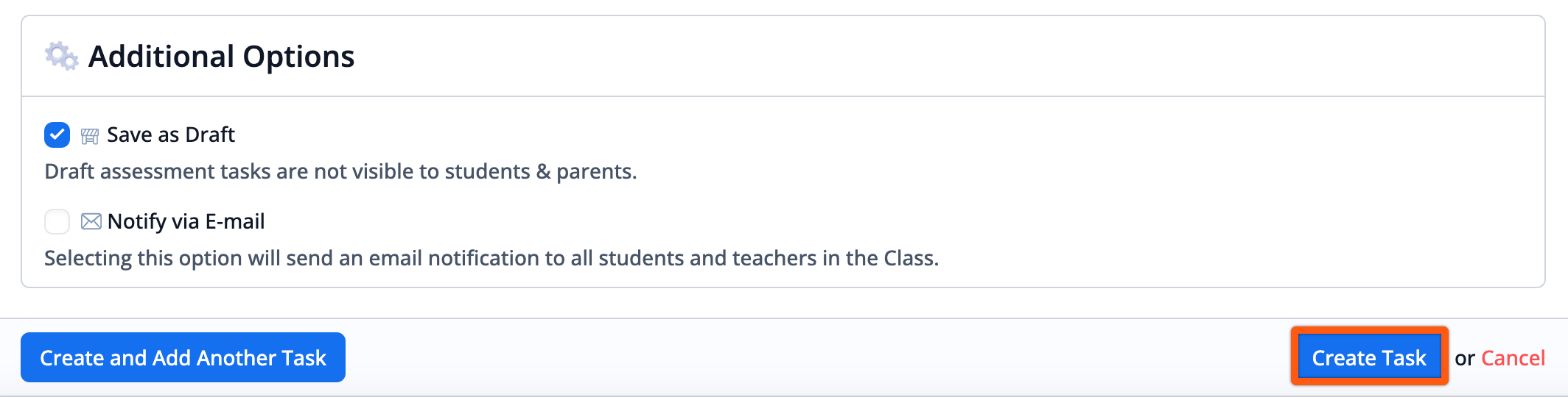 Teachers can also choose the option to Notify Students via E-mail and then click on Create Task to create the Task or Add Another Task which creates the Task and redirects to the Add New Task page.