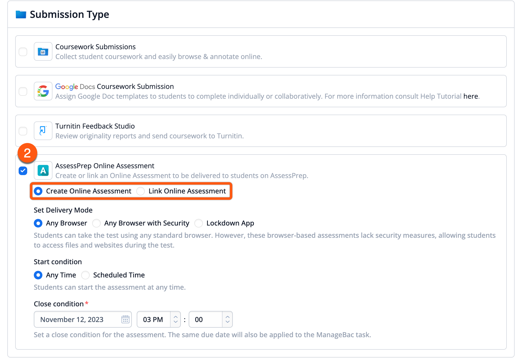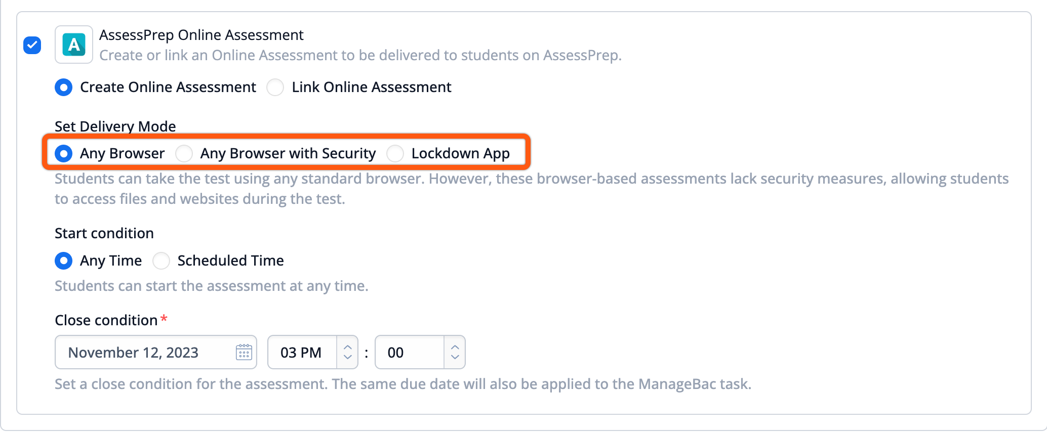 If "Create Online Assessment" is selected, as shown in the screenshot below, you are required to fill out the Delivery Mode, Start condition and Close Condition.