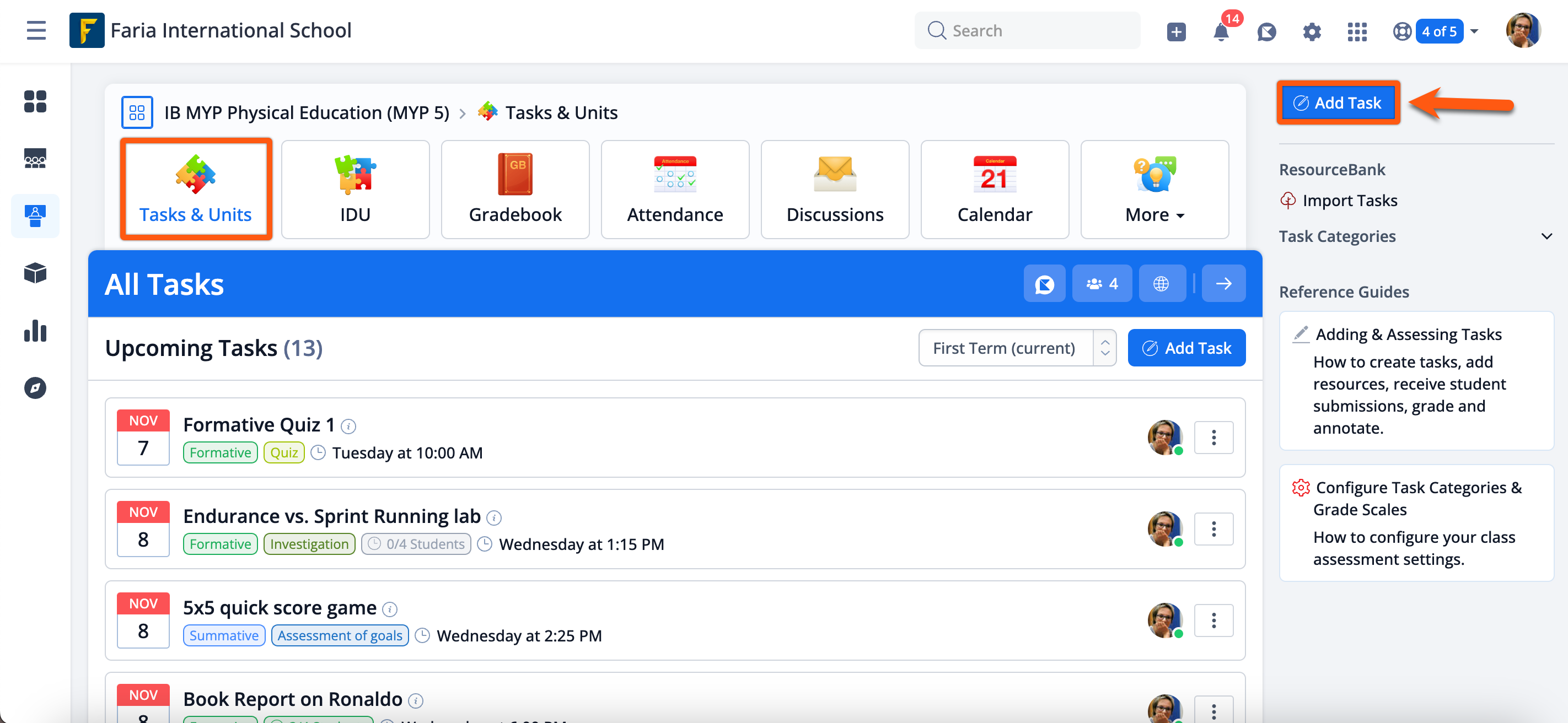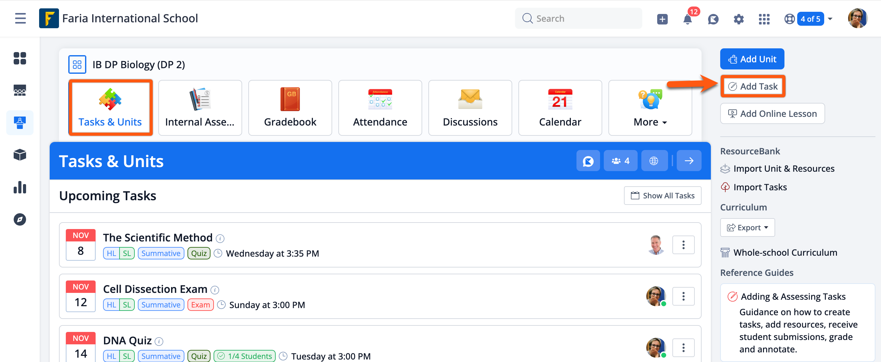 Via the class Tasks & Units tab, teachers can create tasks by clicking on Add Task on the top-right.