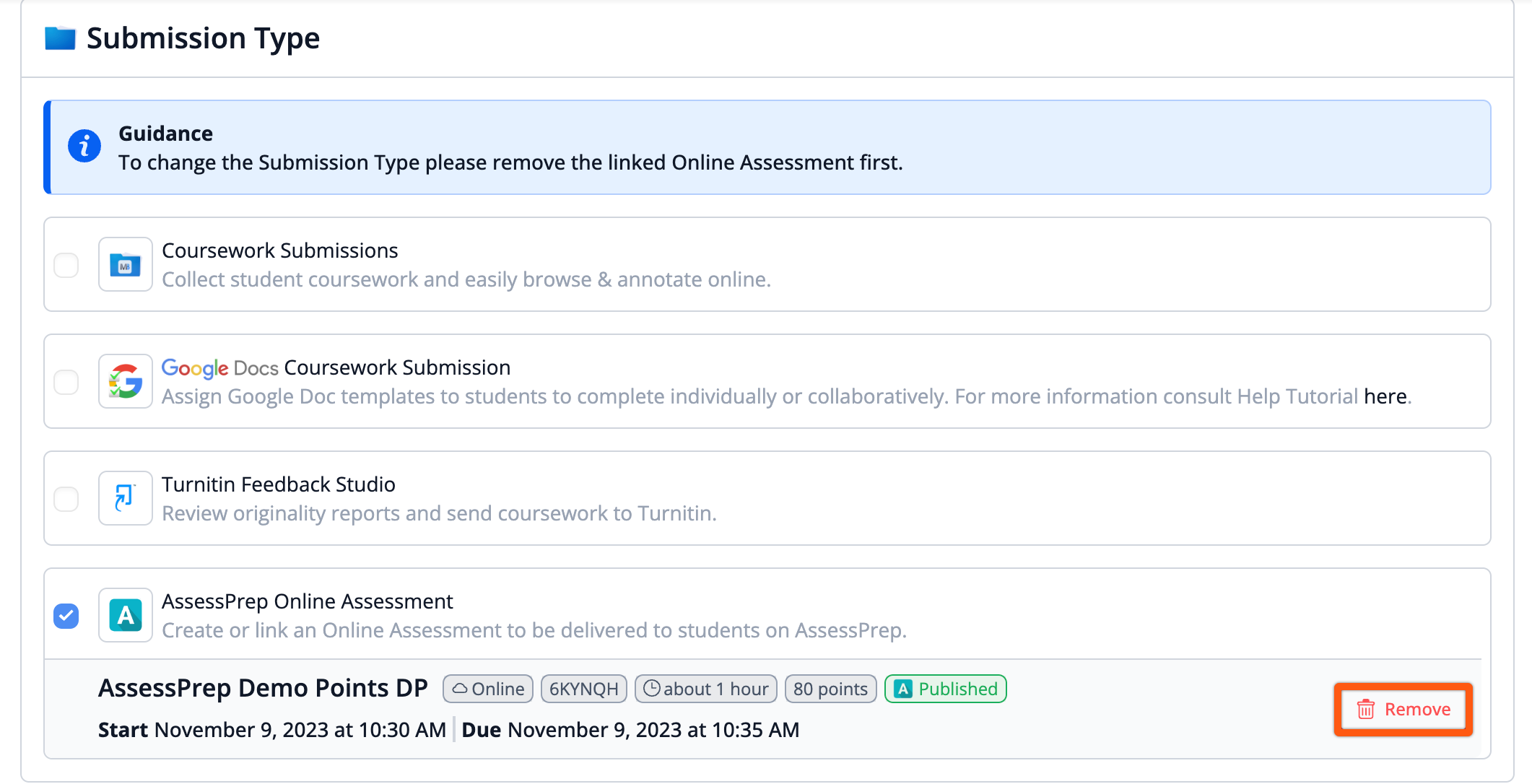 Google Docs Coursework Submission and AssessPrep Online Assessment cannot be enabled together.