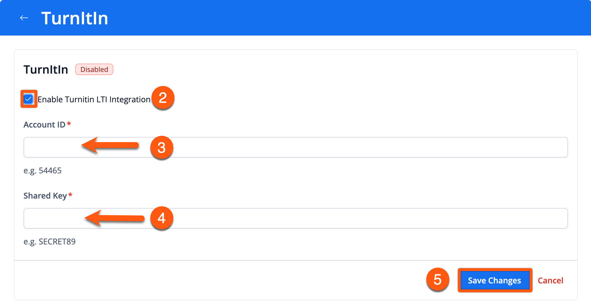 First, you will need to select the Enable Turnitin LTI Integration checkbox. This will allow you to enter the required fields, which include your Turnitin Account ID (e.g. 54439) and shared key (e.g. eight123). Please note both fields are required in order to effectively link your accounts. They are case-sensitive, so they must match identically.
