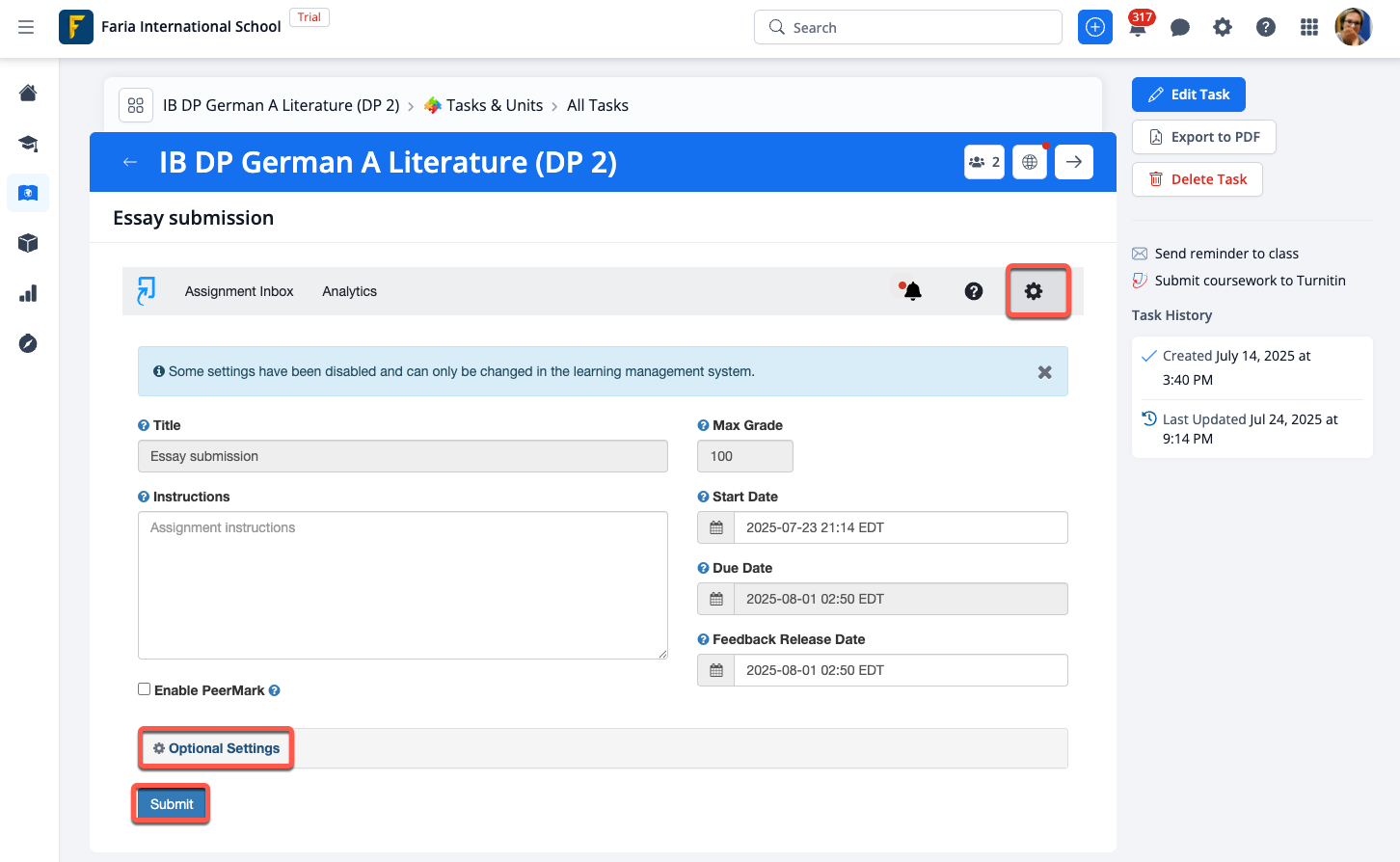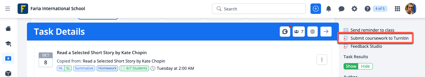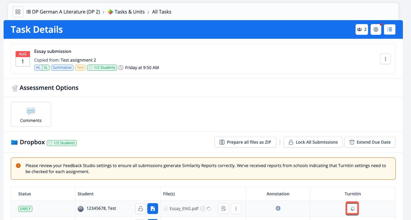 If needed, feel free to edit the due date of the Task or Deadline in ManageBac+ and enable Turnitin at the same time. Then use the Submit Coursework to Turnitin button in the Task or Deadline dropbox to resubmit files already submitted to Turnitin servers and generate a Similarity Index.