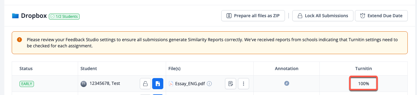The Similarity Index will be shown in the ManageBac+ Deadline or Task Dropbox once you reopen the Deadline or Task Dropbox from the Calendar or Tasks page in ManageBac+.