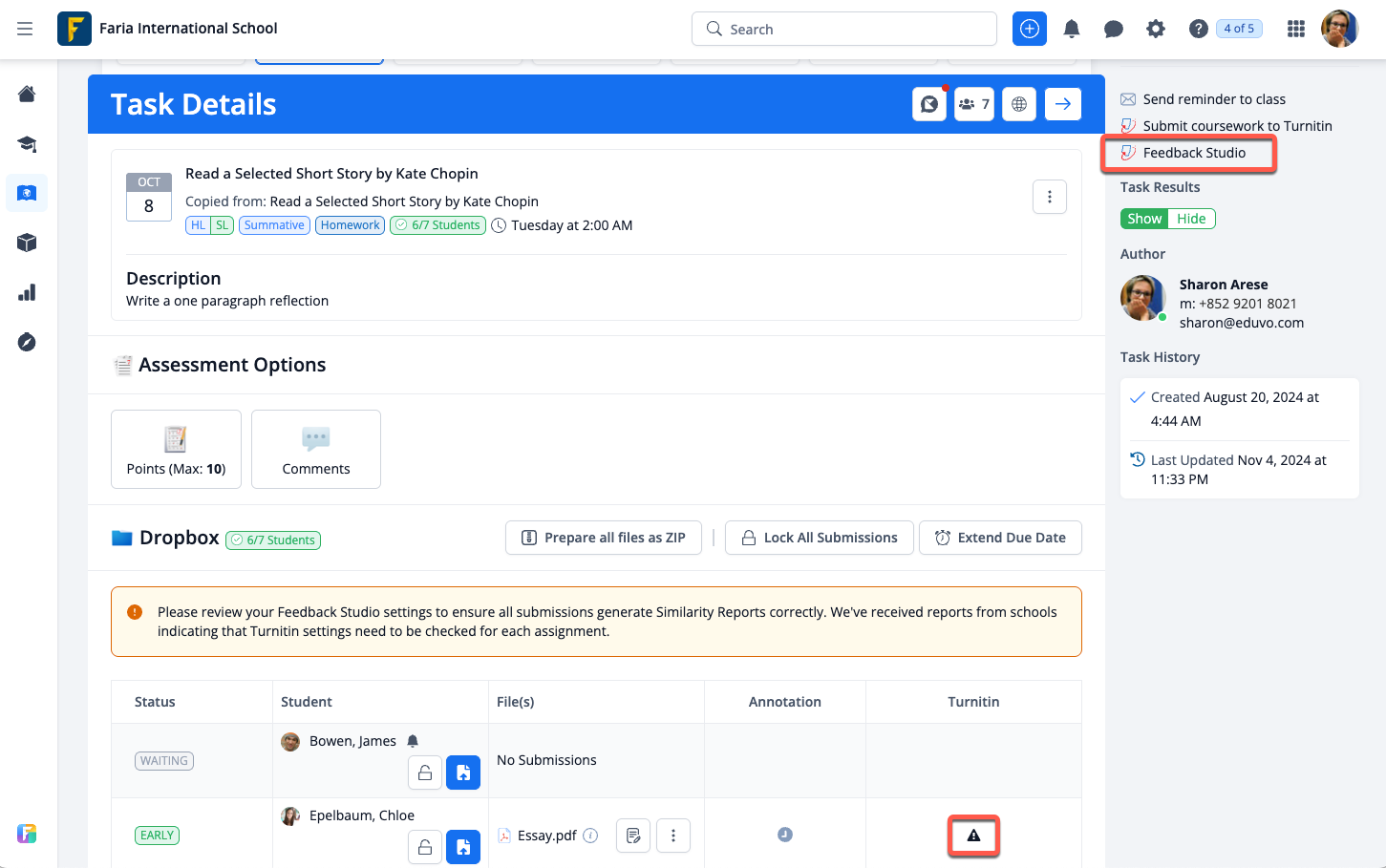 Once the credentials entered in ManageBac+ match the Turnitin credentials for your school, you will be able to access the Feedback Studio in the Task or Deadline Dropbox. Please use the Submit Coursework to Turnitin button in the Task or Deadline Dropbox to generate Similarity Indices for the files submitted.