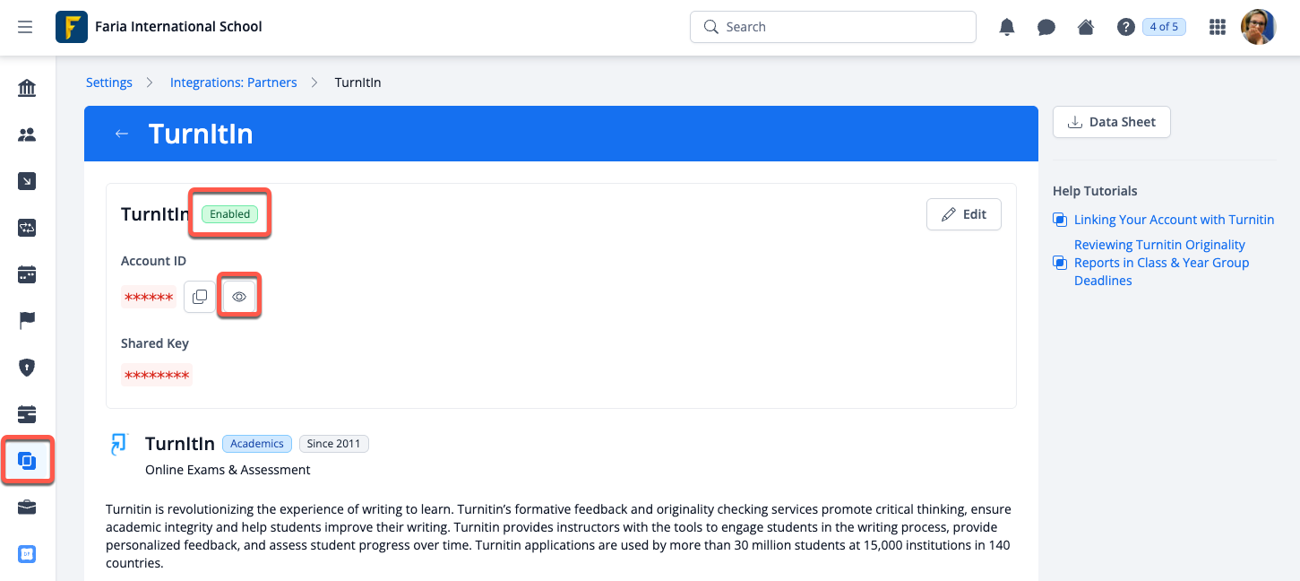 The integration credentials can be reviewed and edited via Settings > Integrations > Partners > Turnitin.