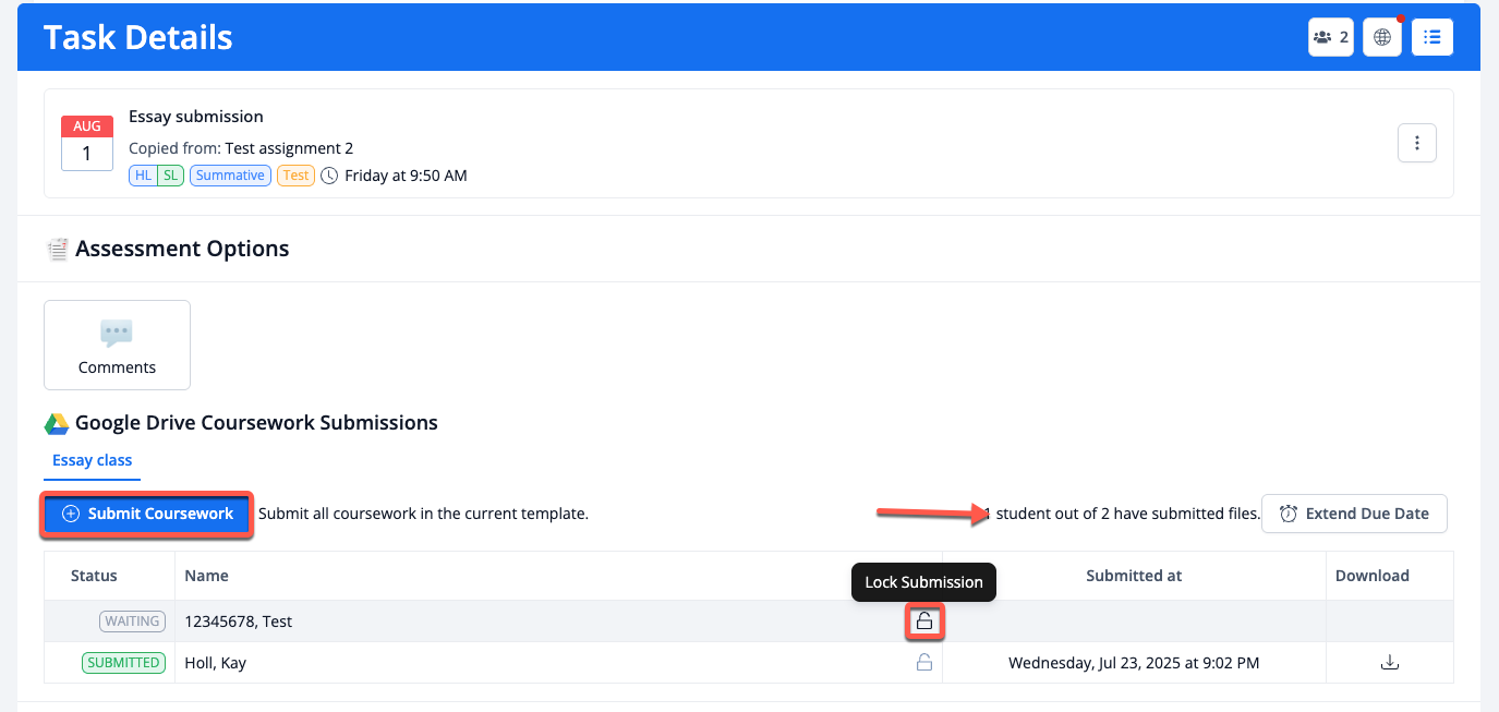 Select a Task in your class with Google Coursework submissions enabled. Teachers can lock and unlock submissions for Tasks either for individual students or for all students in the class.