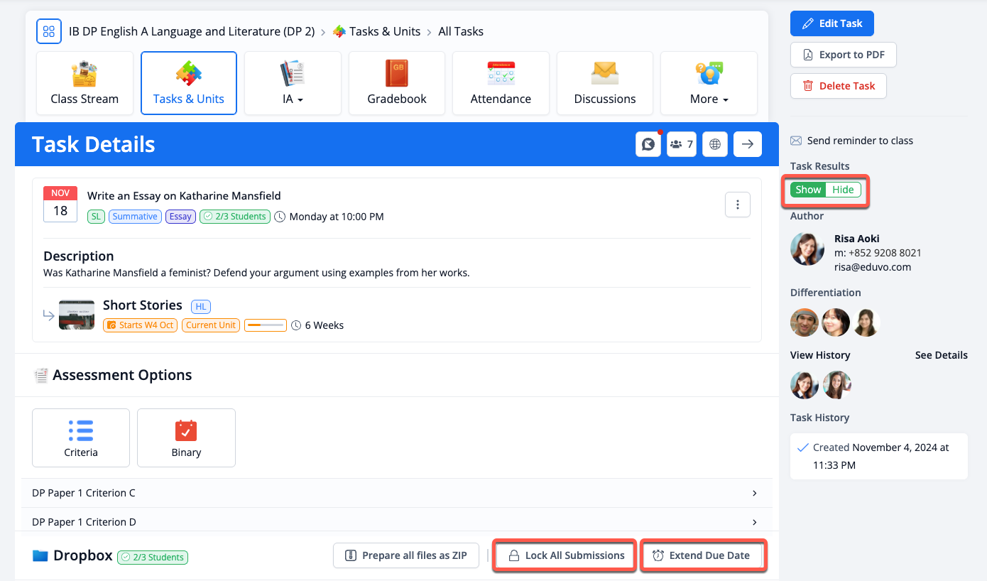Click Extend Due Date to extend the Task due time for individual students for the task.