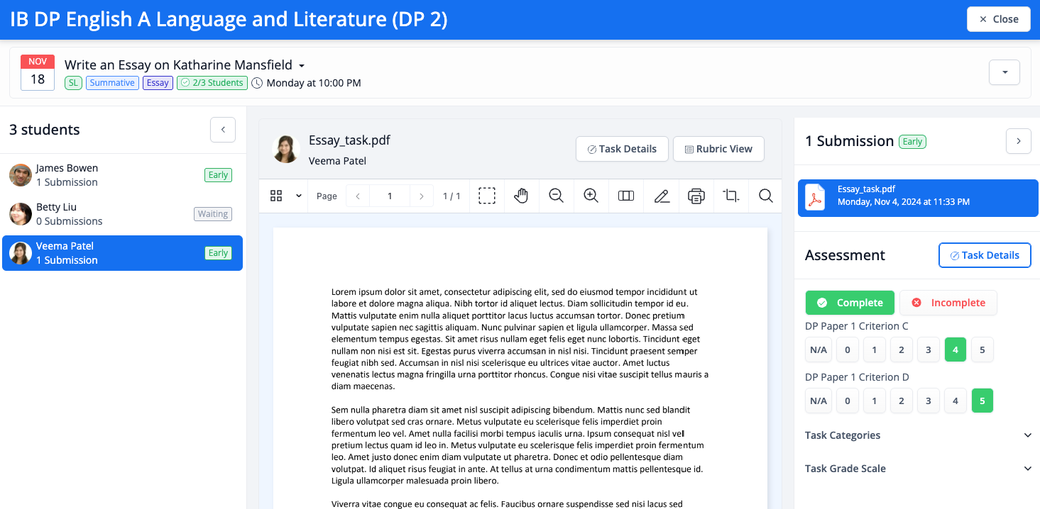 Teachers can switch between students using the left menu. The menu will show student submission status for each template in the task.