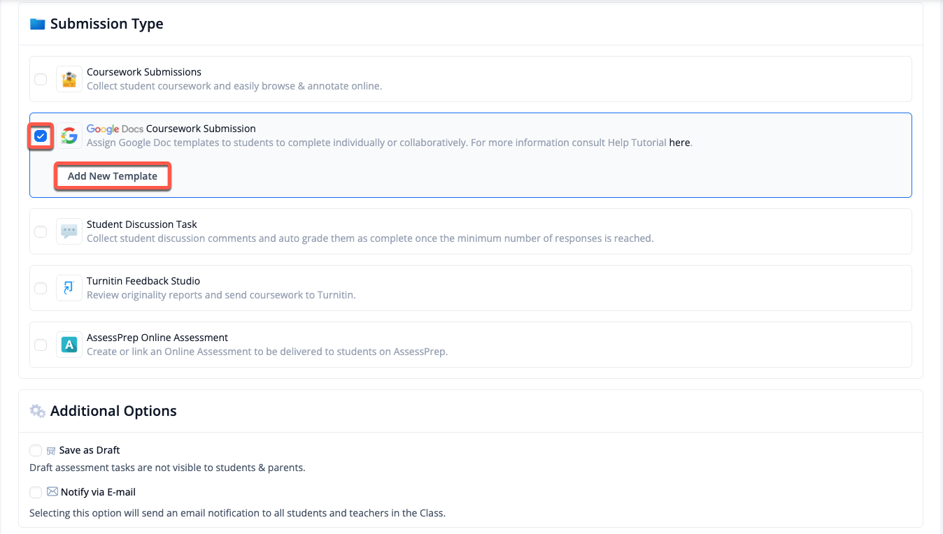 Navigate the school Google Drive account via the File Picker and select the desired template and click submit.
