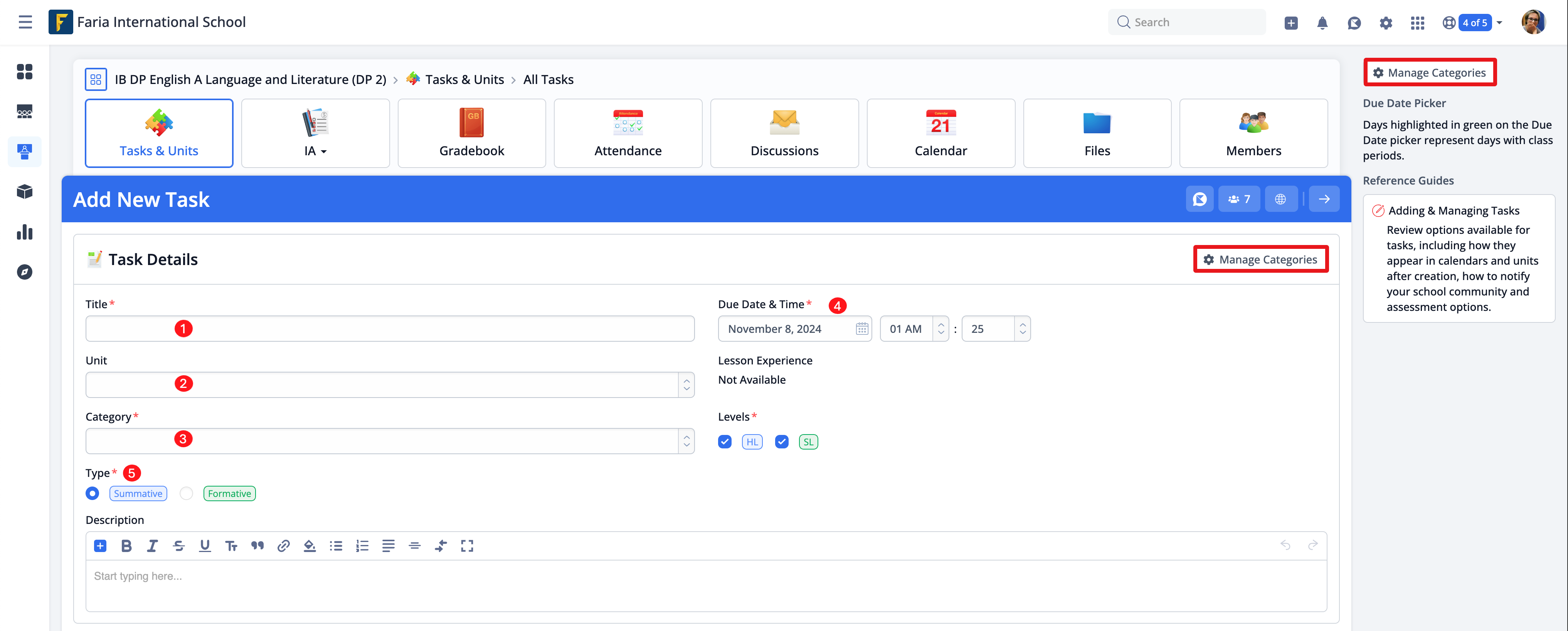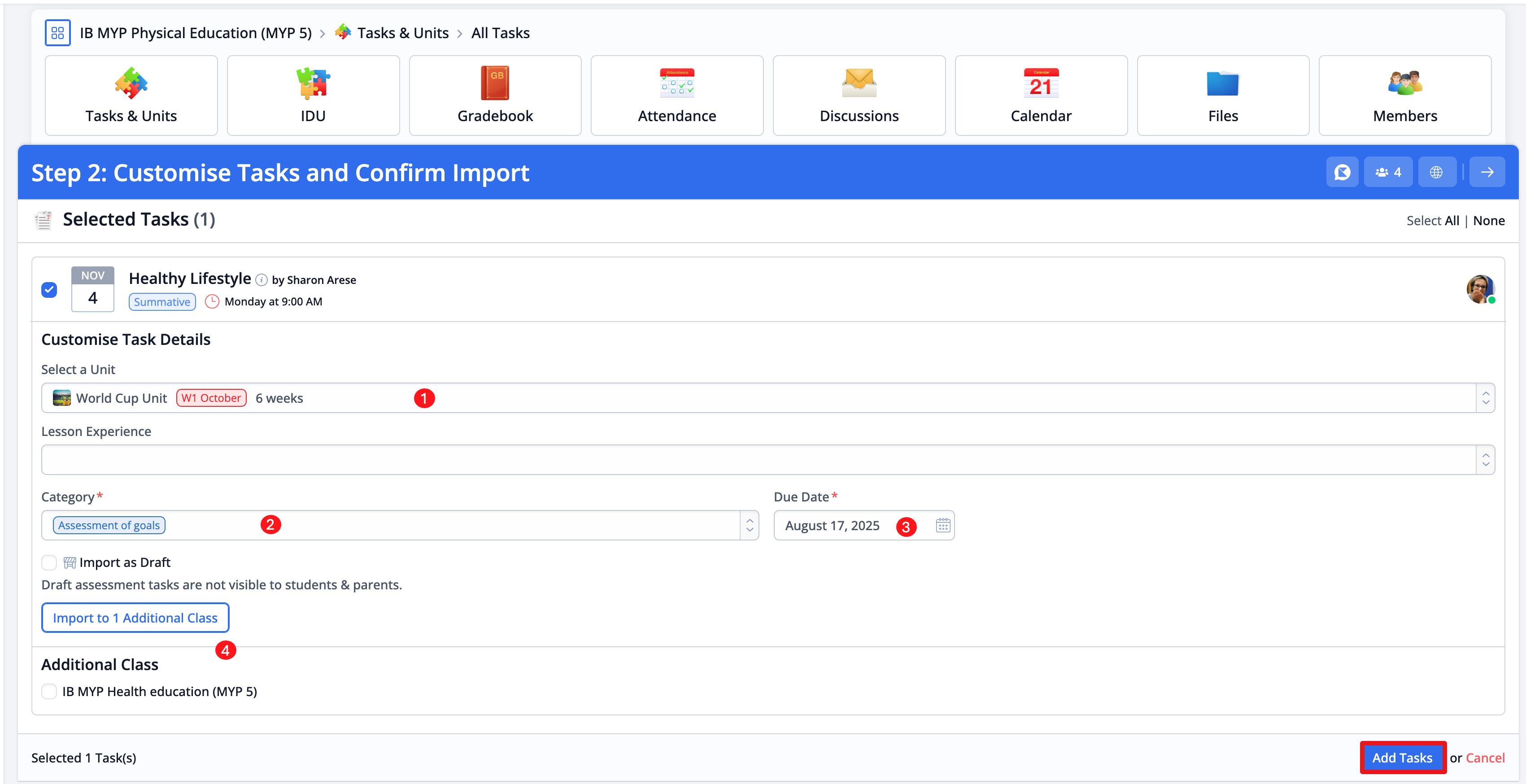 Select the (1) Unit and corresponding Lesson Experience (if available) and choose an appropriate Task (2) Category as well as the (3) Due Date in your class.