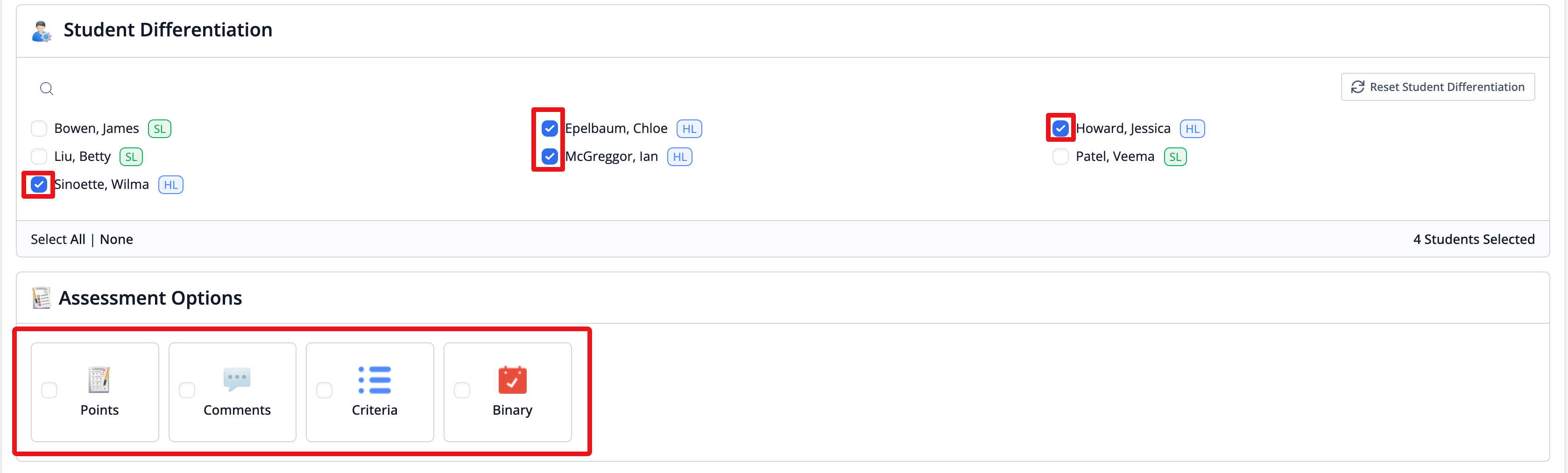 Teachers are able to choose which group of students the task is assigned to in the Student Differentiation section.