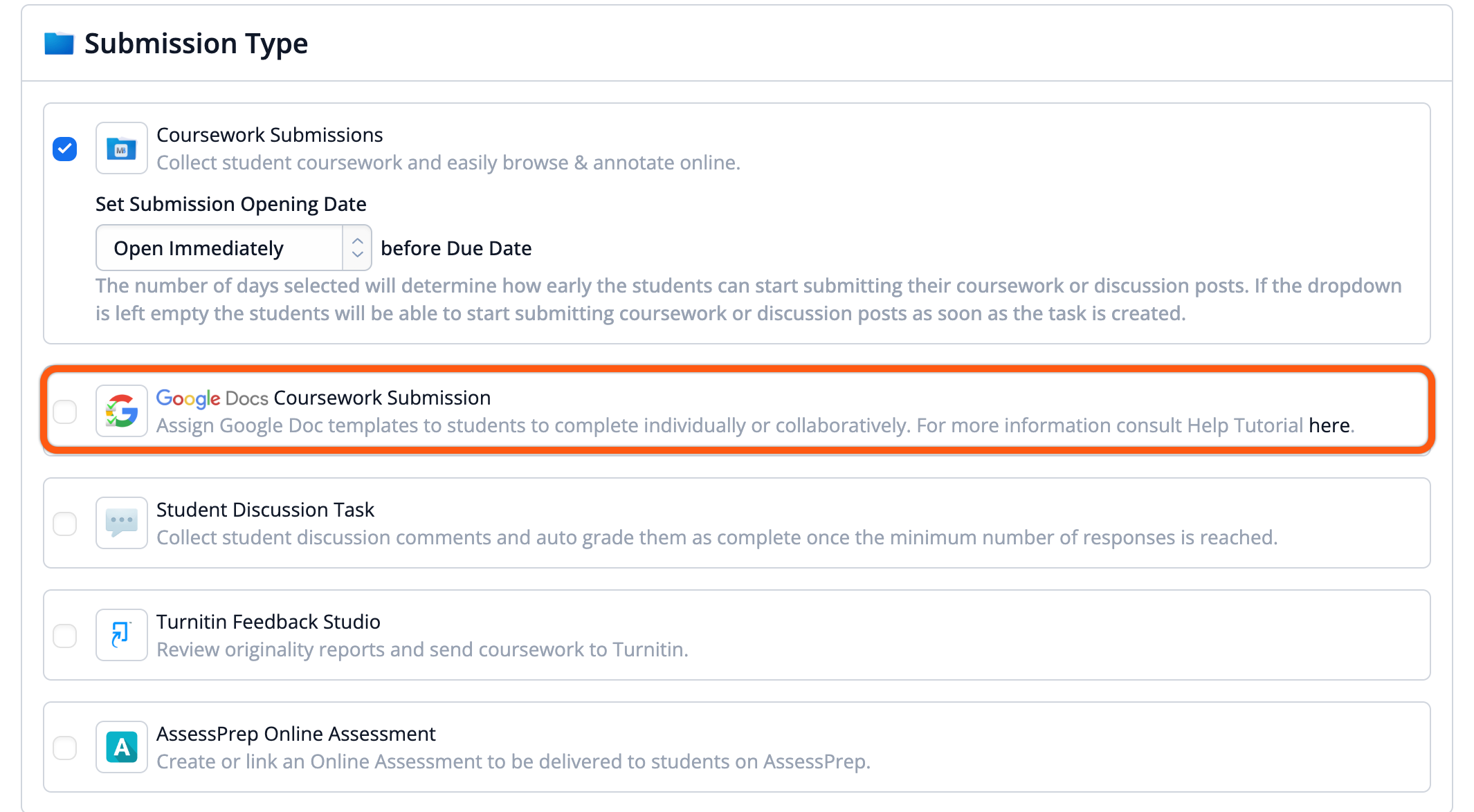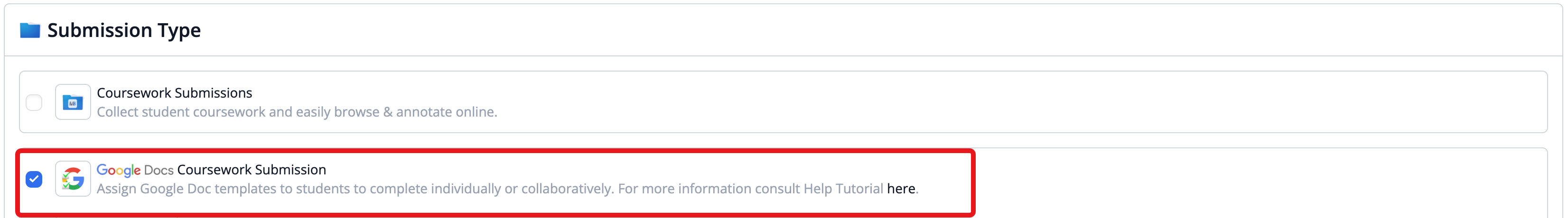 Tick Google Docs Coursework Submission to assign a Gdoc to your students. Click here for further guidance. Note that this is only available if your account administrator has enabled integration with Google Docs.