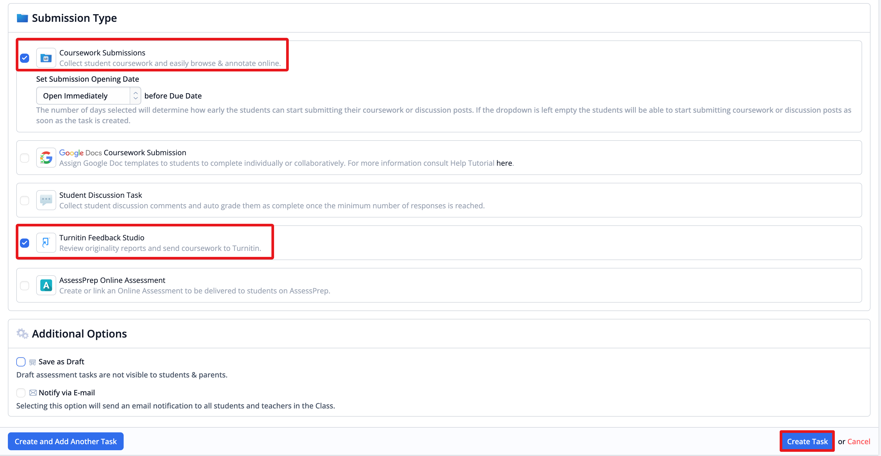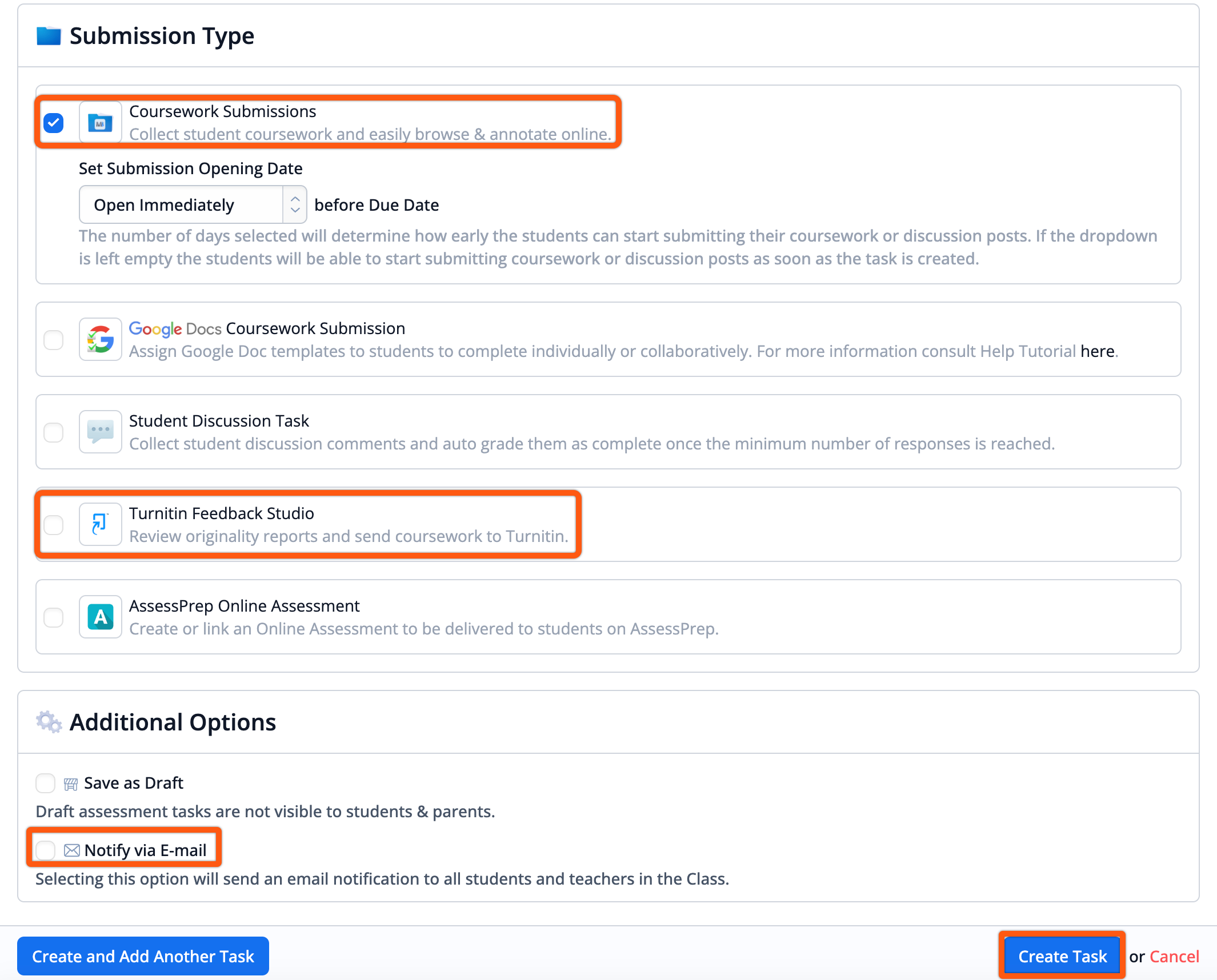Tick Notify Students via email to make students aware of the new Task.