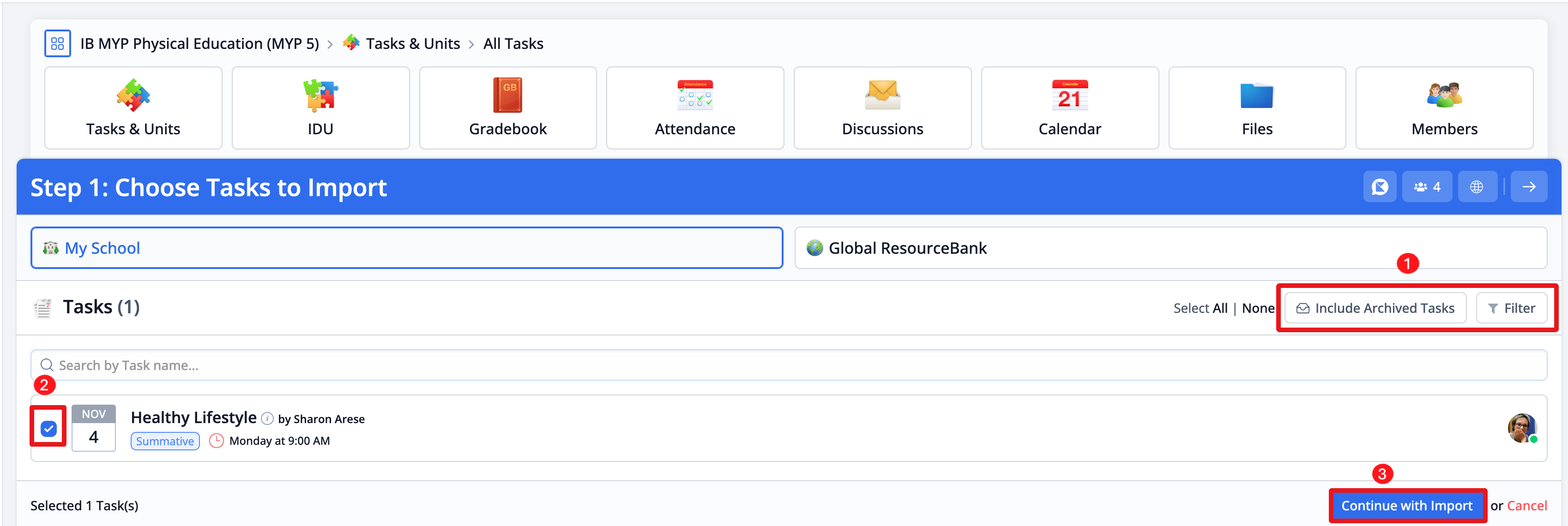 2. Tick the box to the left of the Tasks you wish to import into the class.