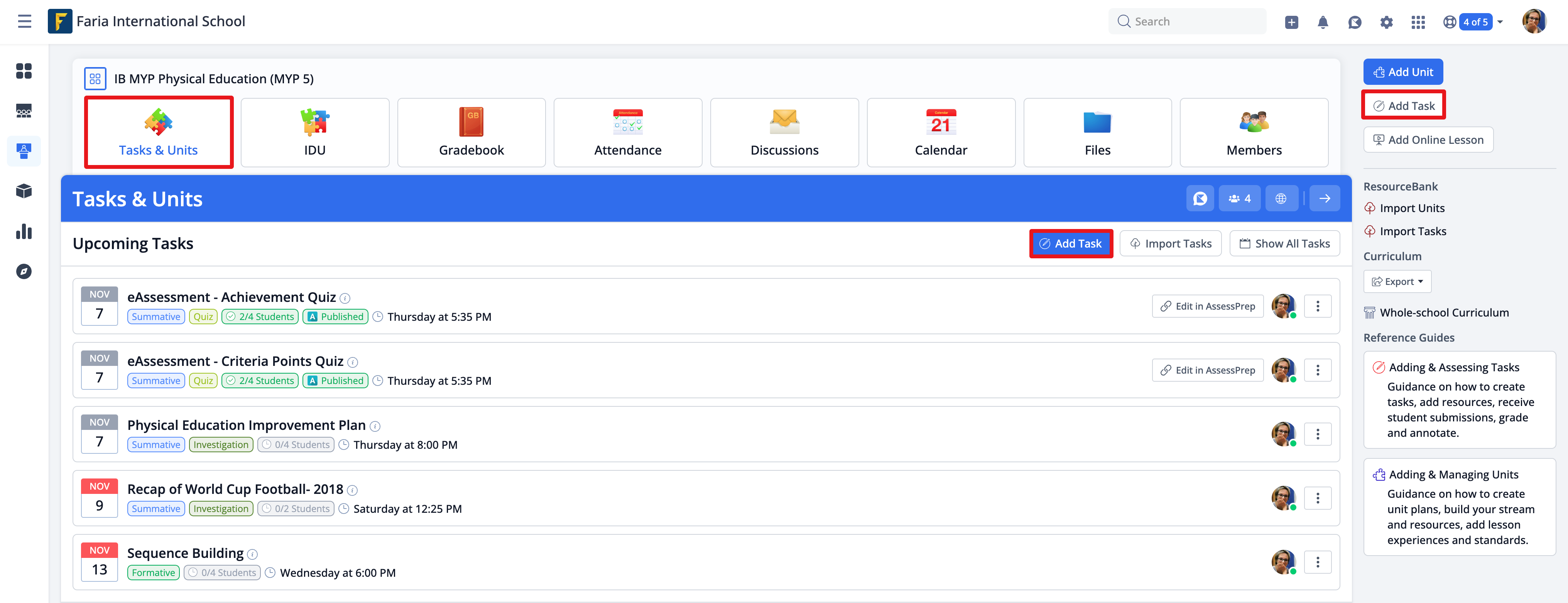 Teachers can add tasks to classes via the class Tasks & Units tab, click Add Task