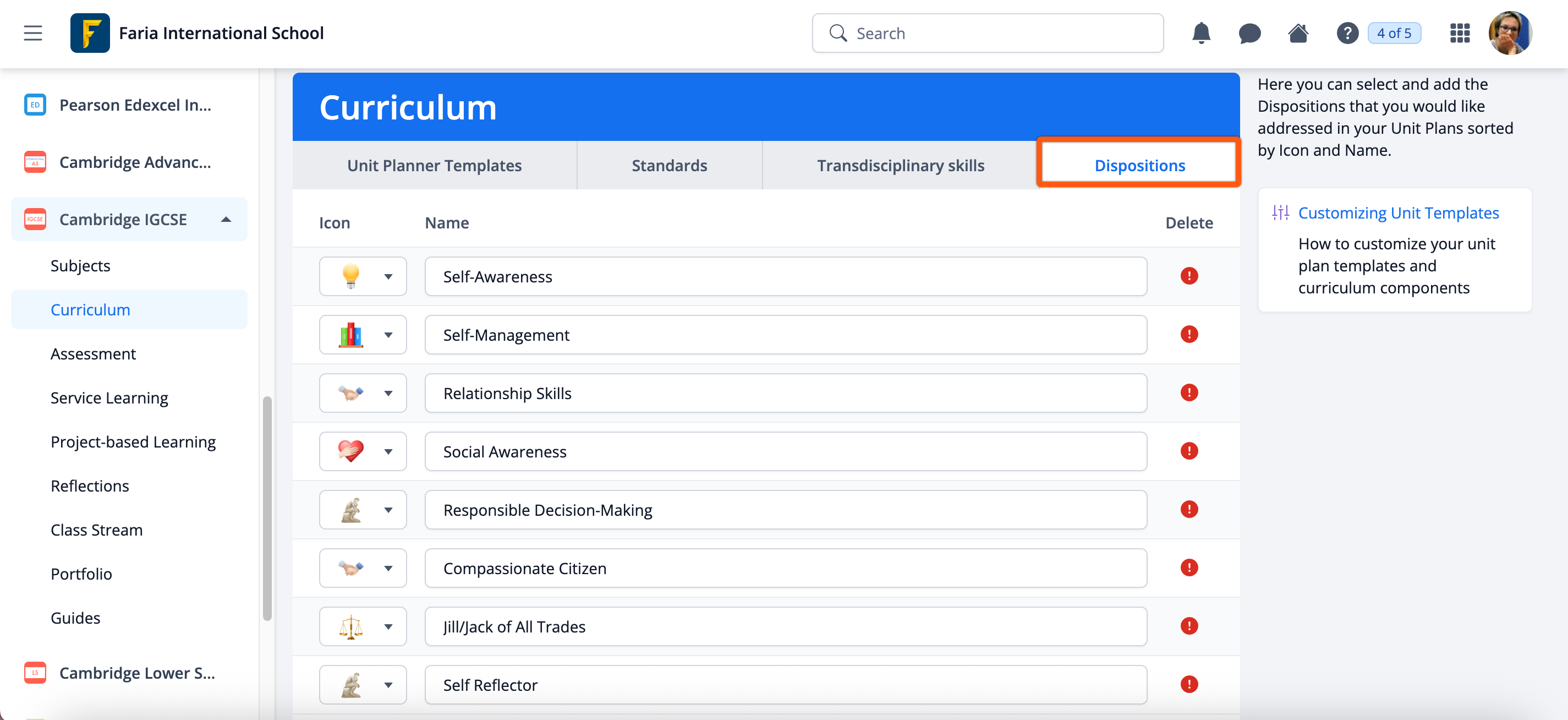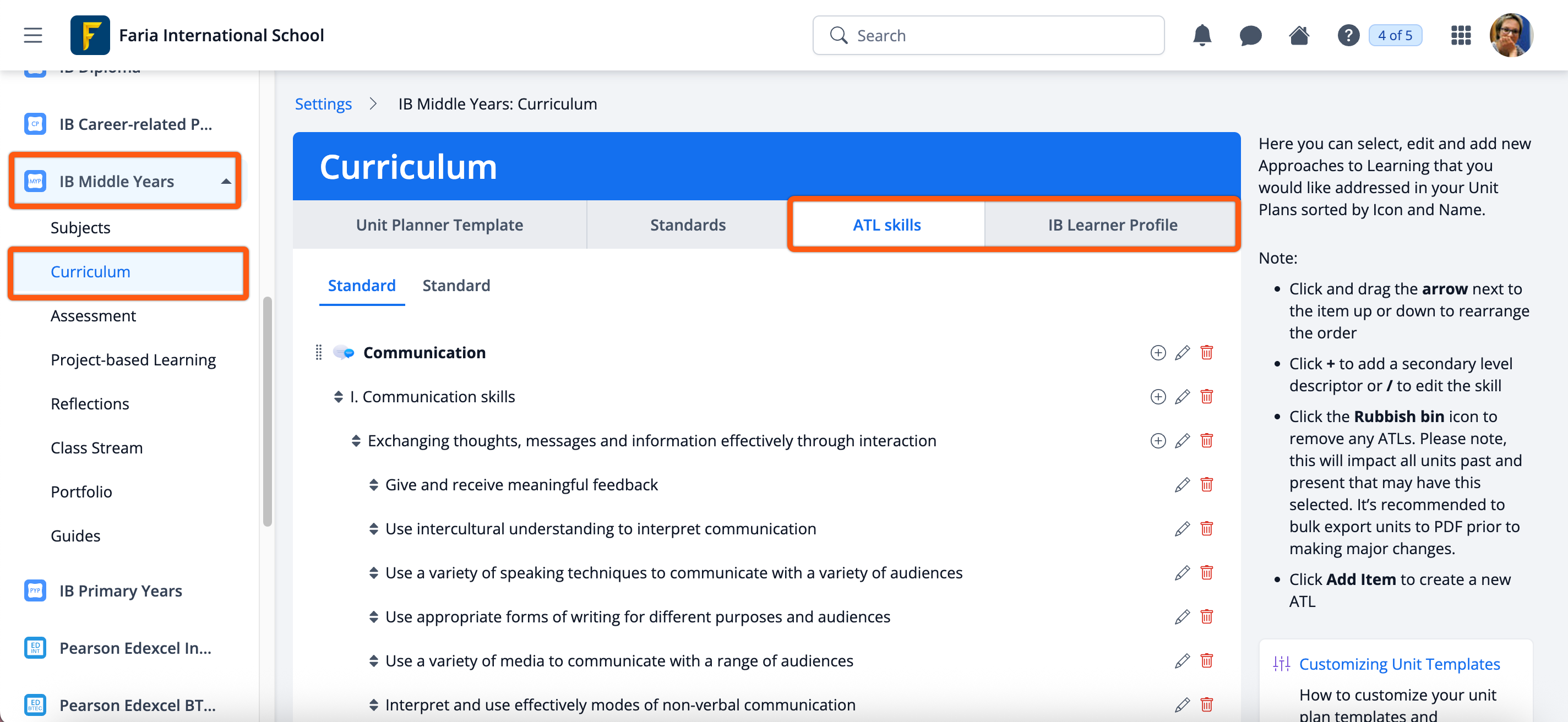 ATL Skills and IB Learner Profile attributes/Dispositions can be changed in the following ways: