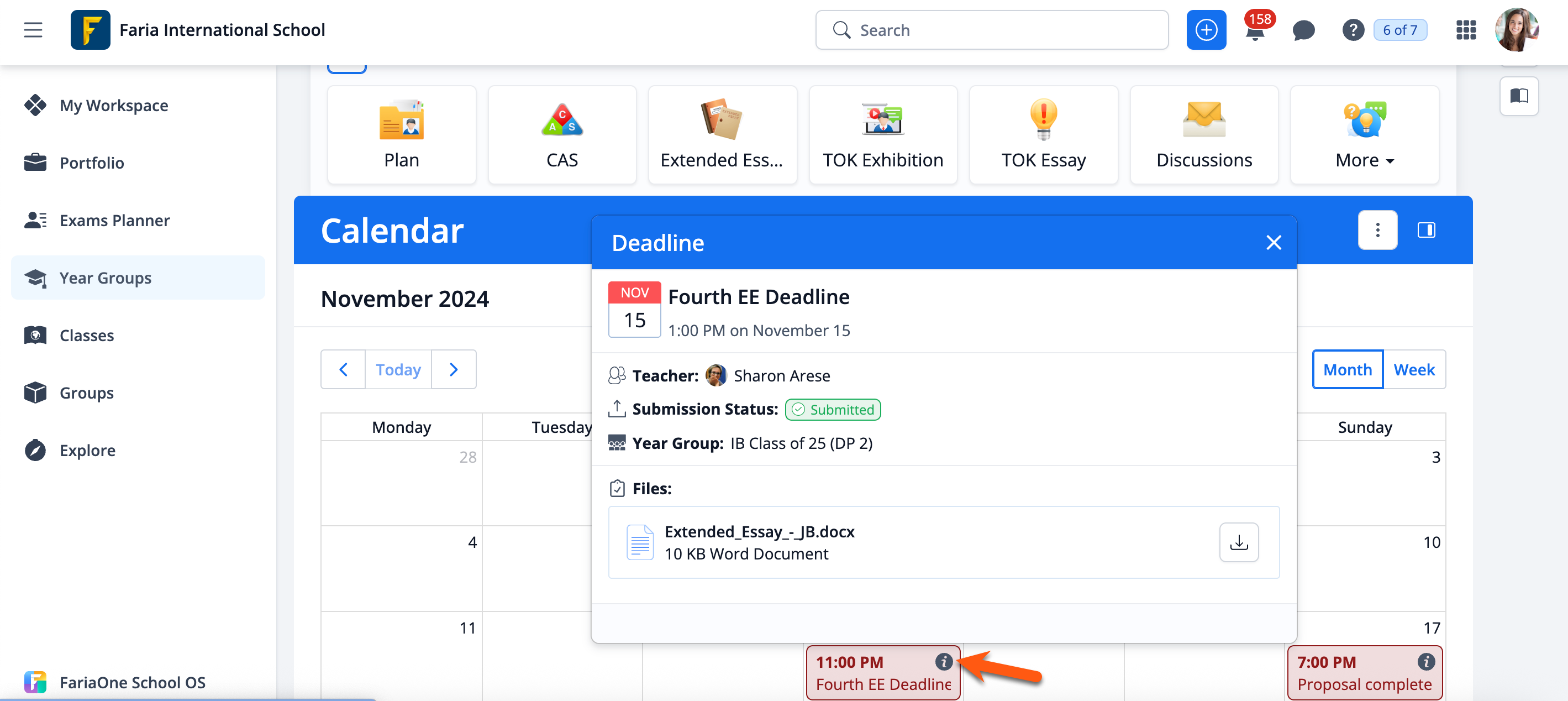 By hovering over the "i" icon in the bottom right corner of an event or deadline you will be able to view more details. Such as, files and description. Additionally, if it is a deadline with dropbox submission enabled you will be able to submit a file before the deadline.