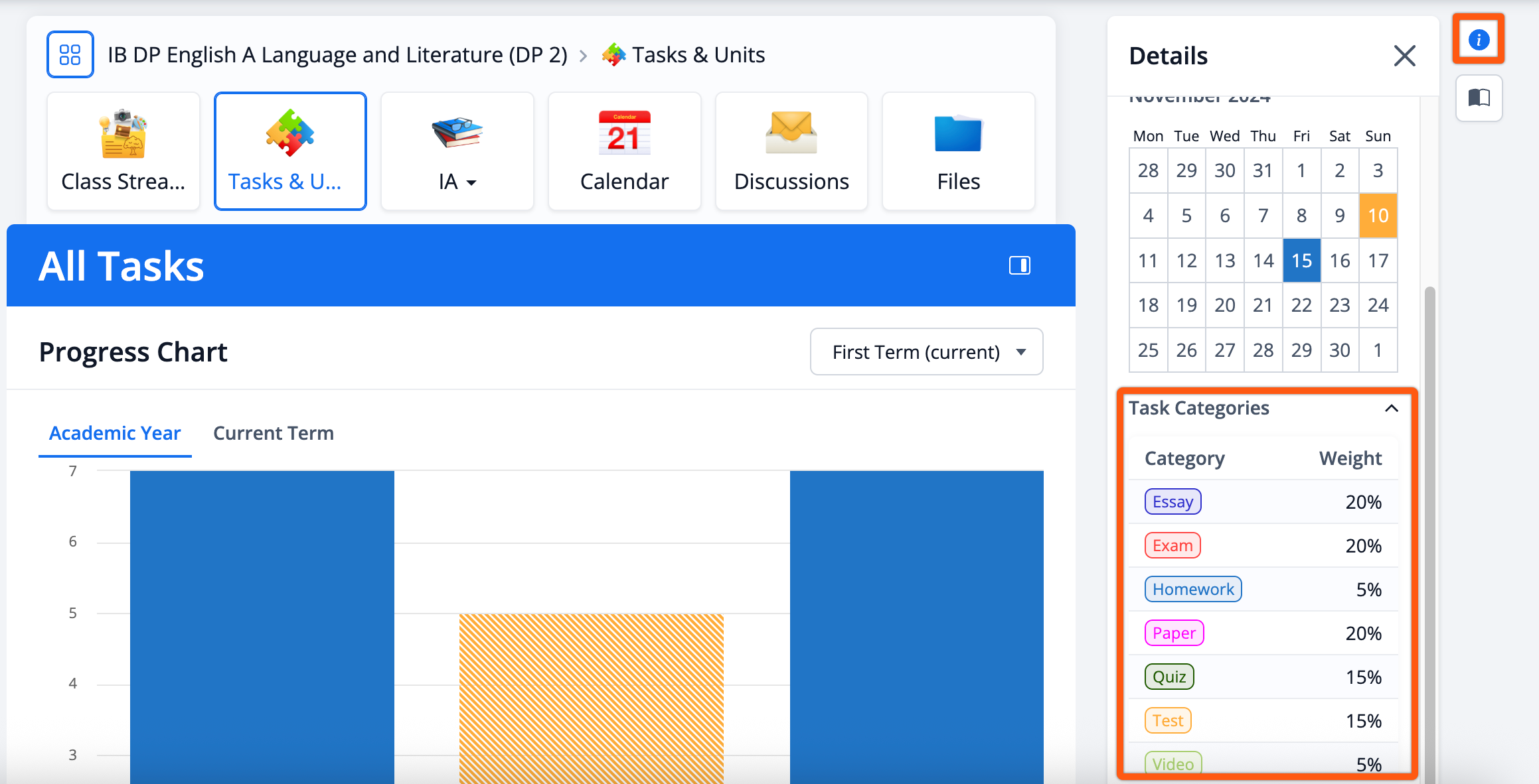 You can see the colour-coded Task Categories and the weighting of each type of tasks on the right navigation panel.