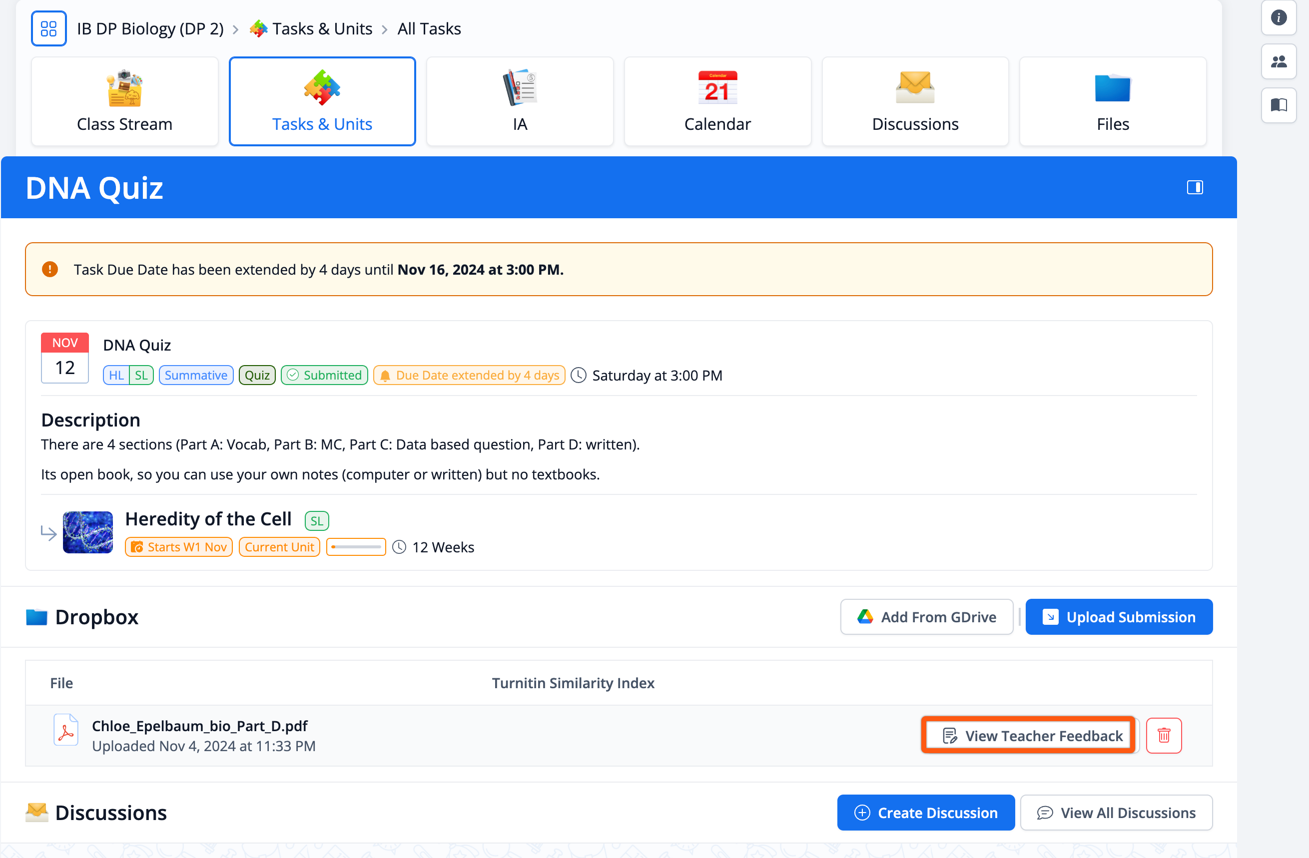 If you scroll down, you will be able to see the upcoming and completed tasks of the class.