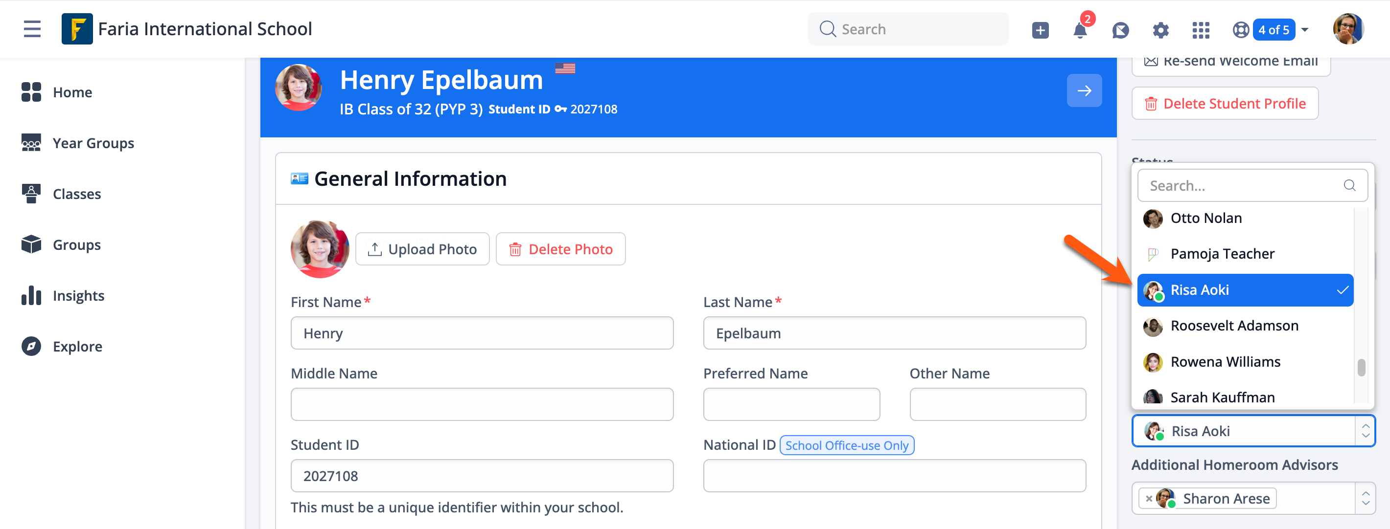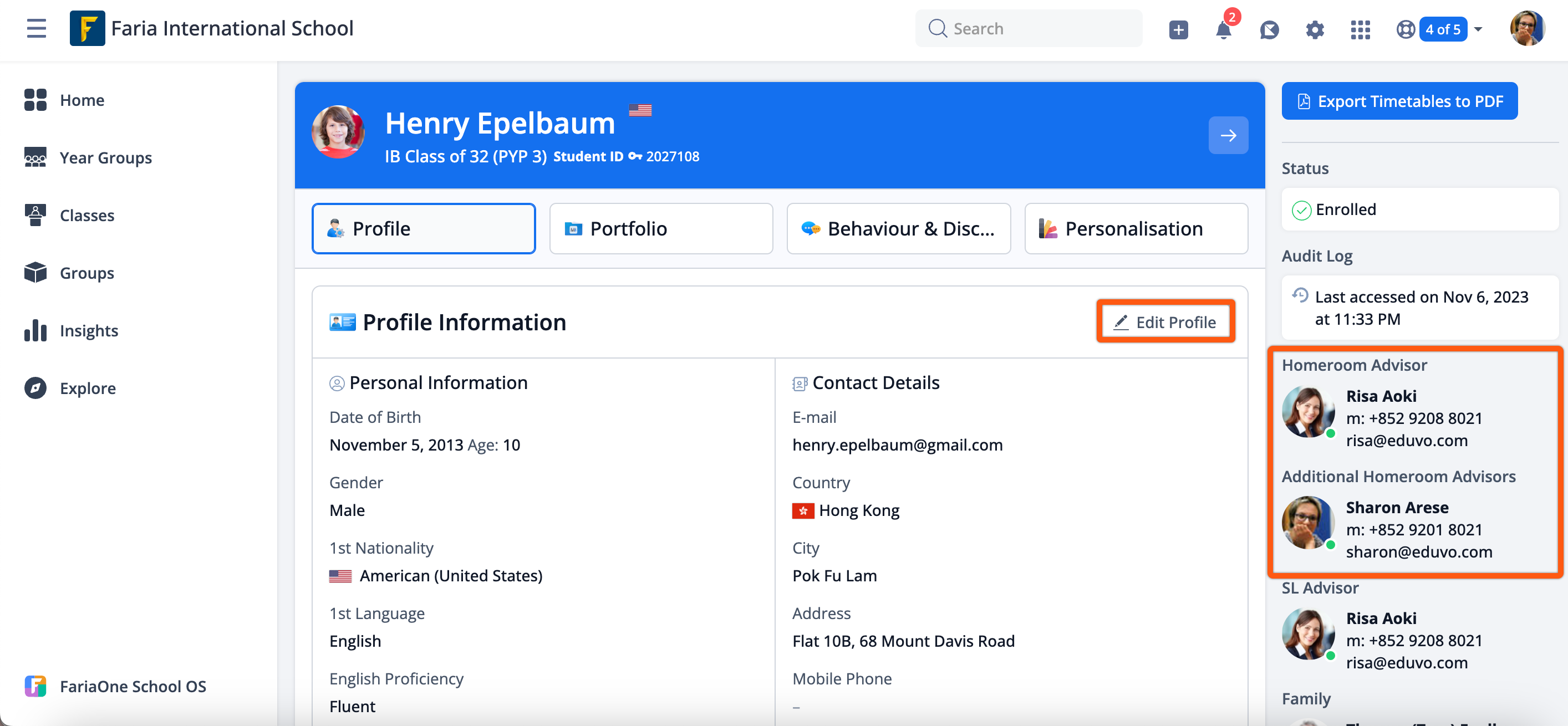 On the right-hand side, you will be able to see their currently assigned Homeroom Advisor and Additional Homeroom Advisors, if any. You can update this if needed by clicking Edit Profile.