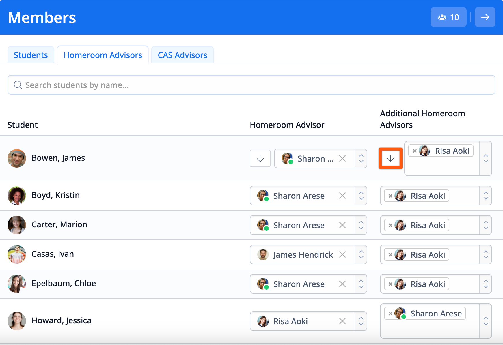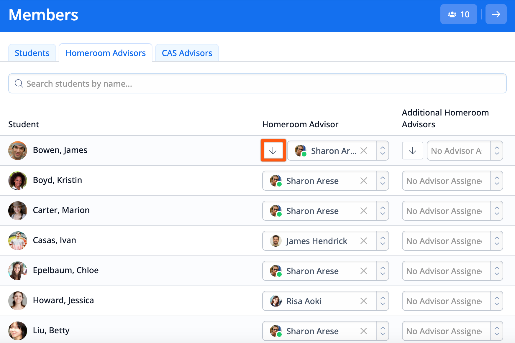 Click the drop-down arrow to quickly assign the additional advisors in the top row to all students below.