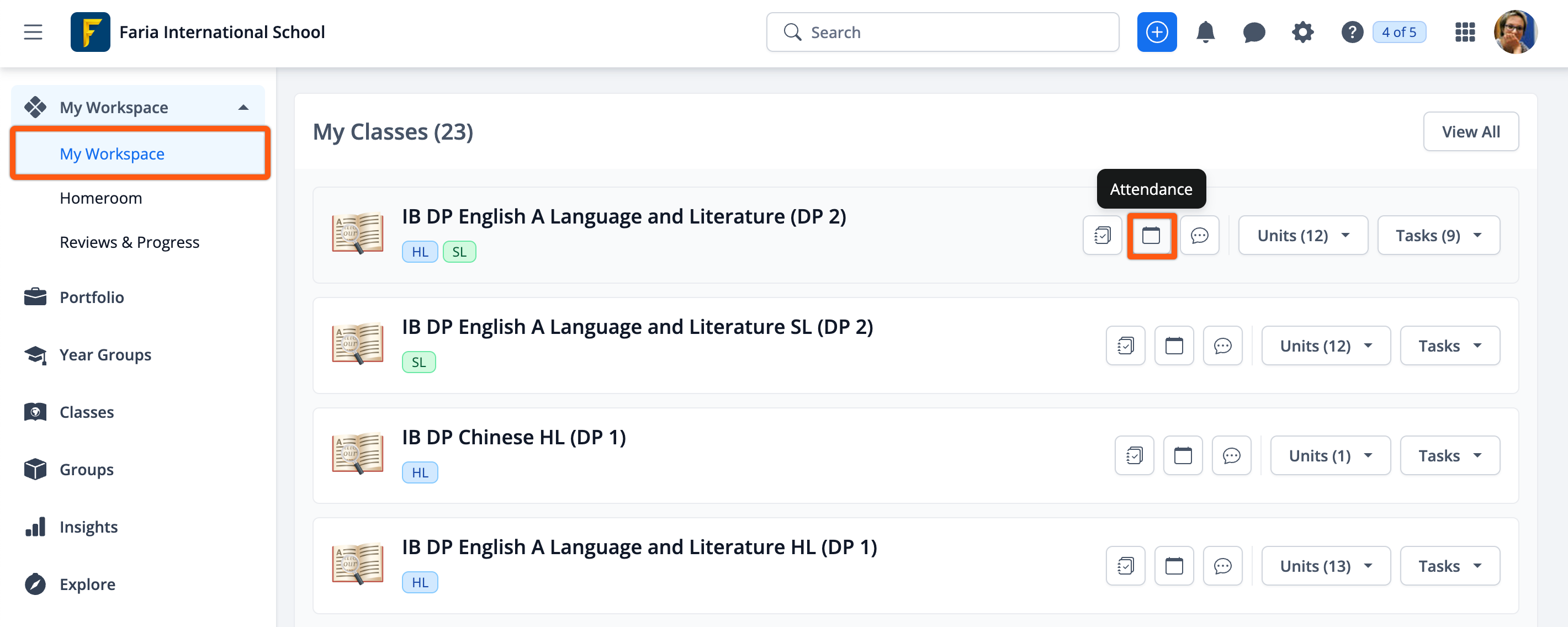 Here you'll find the Attendance icon alongside each class as highlighted in the screenshot below.