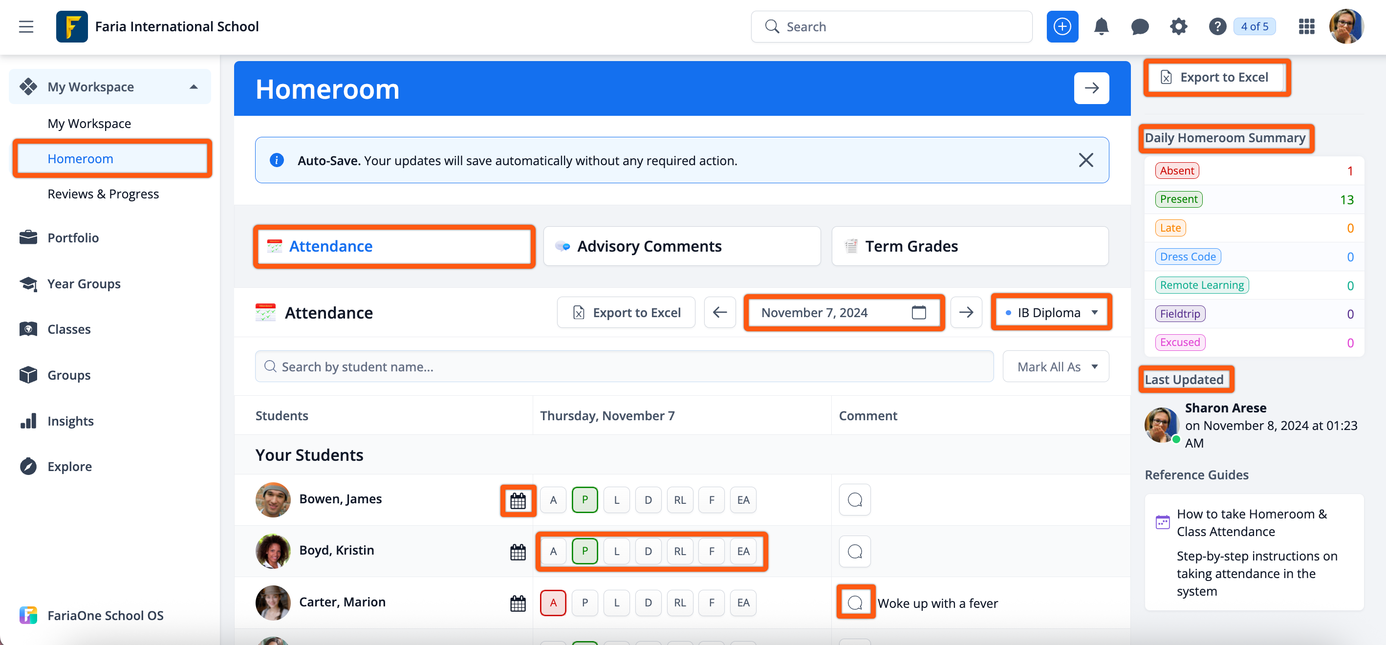 - Homeroom Attendance marked as Absent will be reflected in the student's classes for the day, to give context to class teachers.