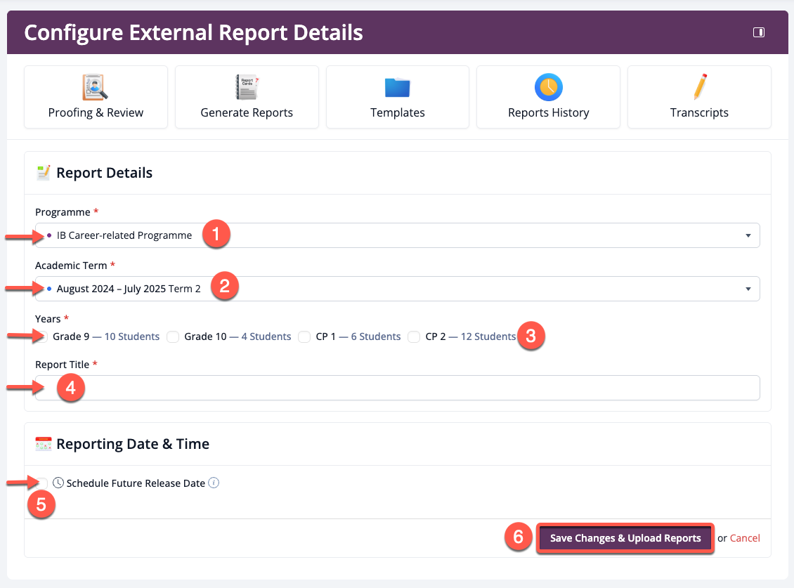 Select the (1) Programme, (2) Academic Term, (3) Grade Levels to be included and set the (4) Report Title and (5) Reporting Date (the current date will be used as Report Card release date if no future release date is set). Then click (6) Save Changes & Upload Reports to create the parent Report Card entry.