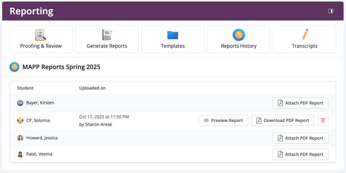 Once changes are saved - you will be redirected to the Student roster view that allows uploading individual PDFs (up to 100MB) for each student, with validations for file type (only PDF files can be selected for upload) and size (only PDF files less than 100MB can be selected).