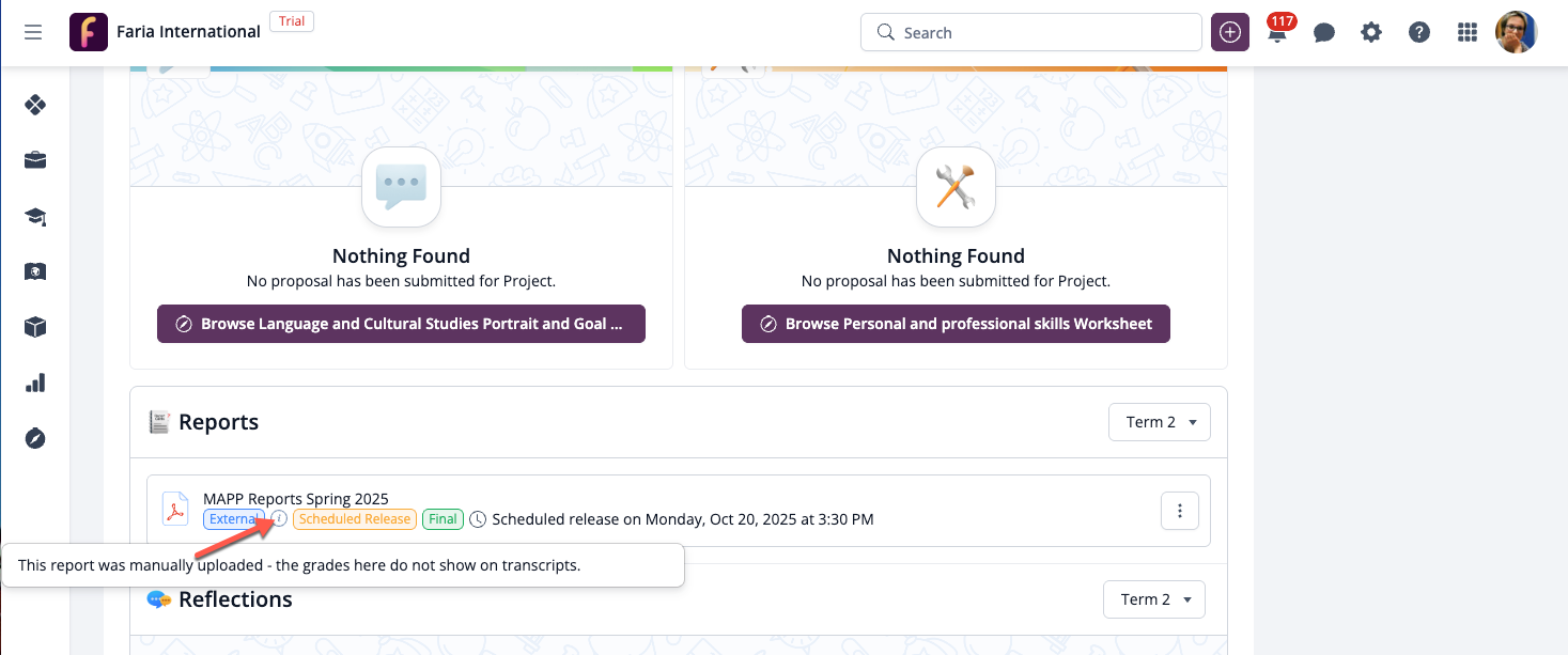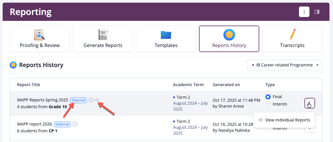This update and addition allows administrators to include non-ManageBac reports in student profiles by uploading PDFs directly in ManageBac via the Reports History pages. This ensures all student records can be consolidated in one place and reduces the dependency on our support team during reporting season.