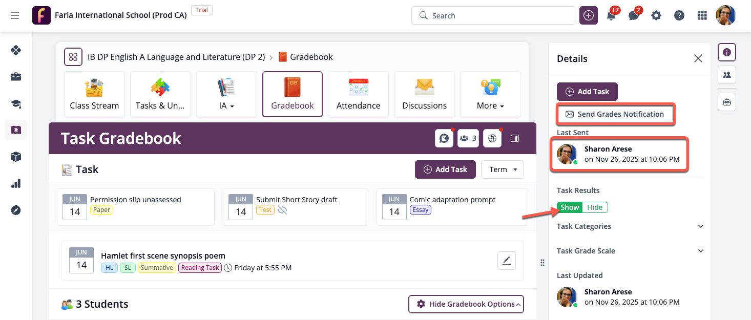 Tasks with grades or comments entered and the Task Results option set to "Show" now will log on the right sidebar which user and when sent the Grades Notifications most recently. This provides more clarity about when notifications for Task Grades were sent and allows classes with multiple teachers to stay more organised.
