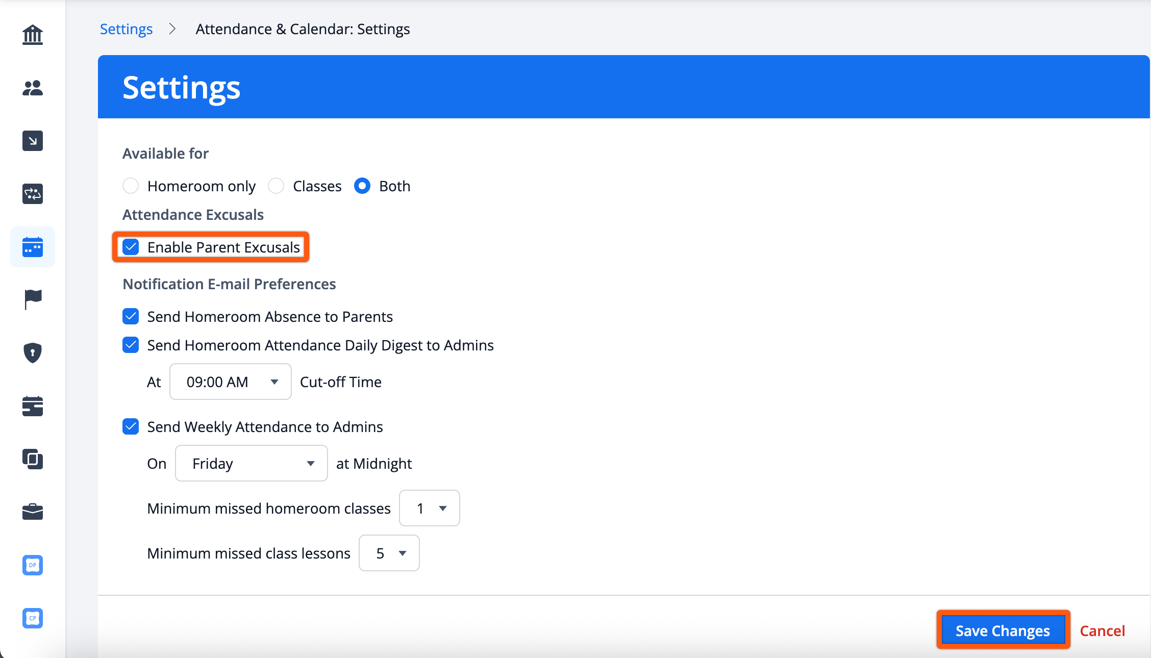 Attendance Excusals can now be hidden from parents. This is a school-wide setting and it’s not available per programme. The ability to submit attendance excusals can be hidden from parents via Settings > Attendance & Calendar > Settings. You can un-check “Enable Parent Excusals” and then Save Changes.