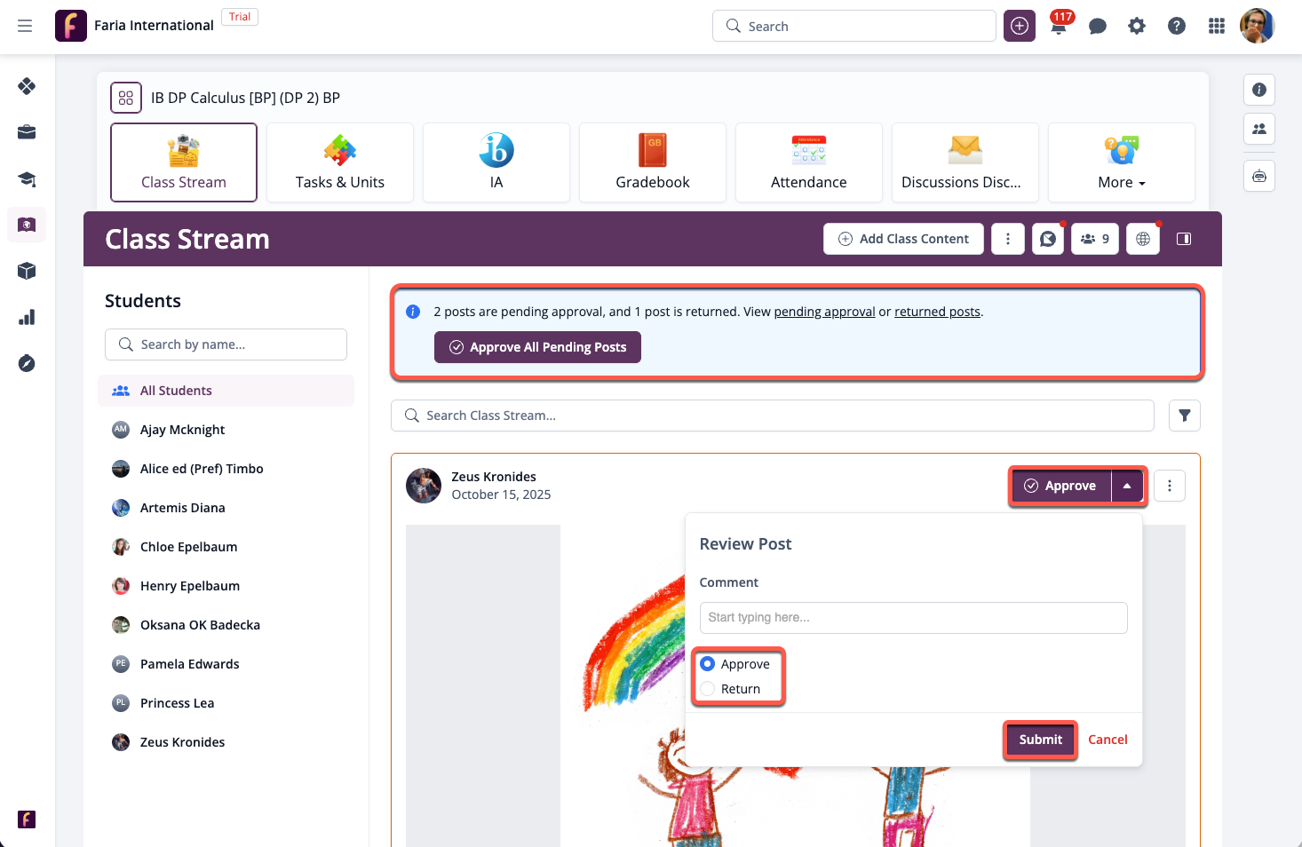 Schools can enable the Post Moderation function for Class Streams in each academic programme so that student posts made to the Class Stream can be approved or returned by any teacher in the class.