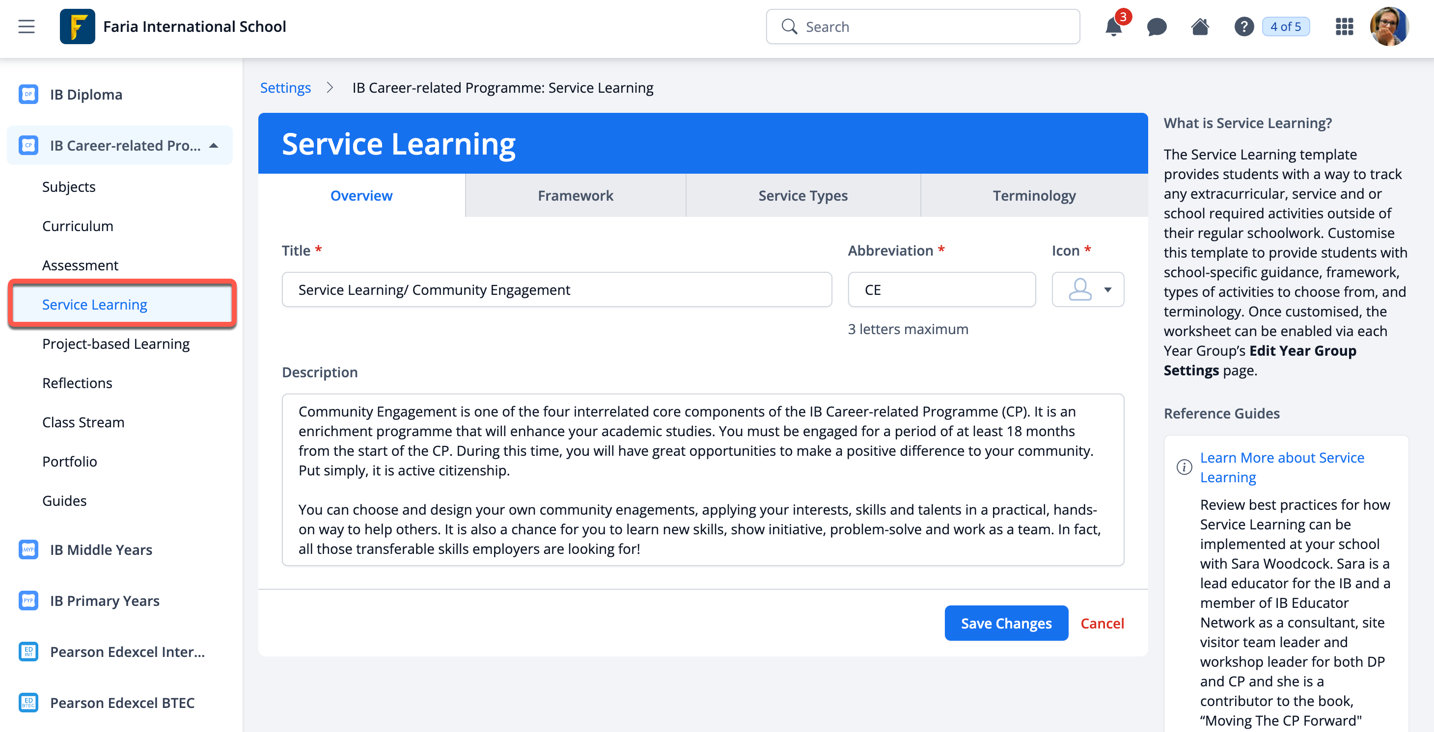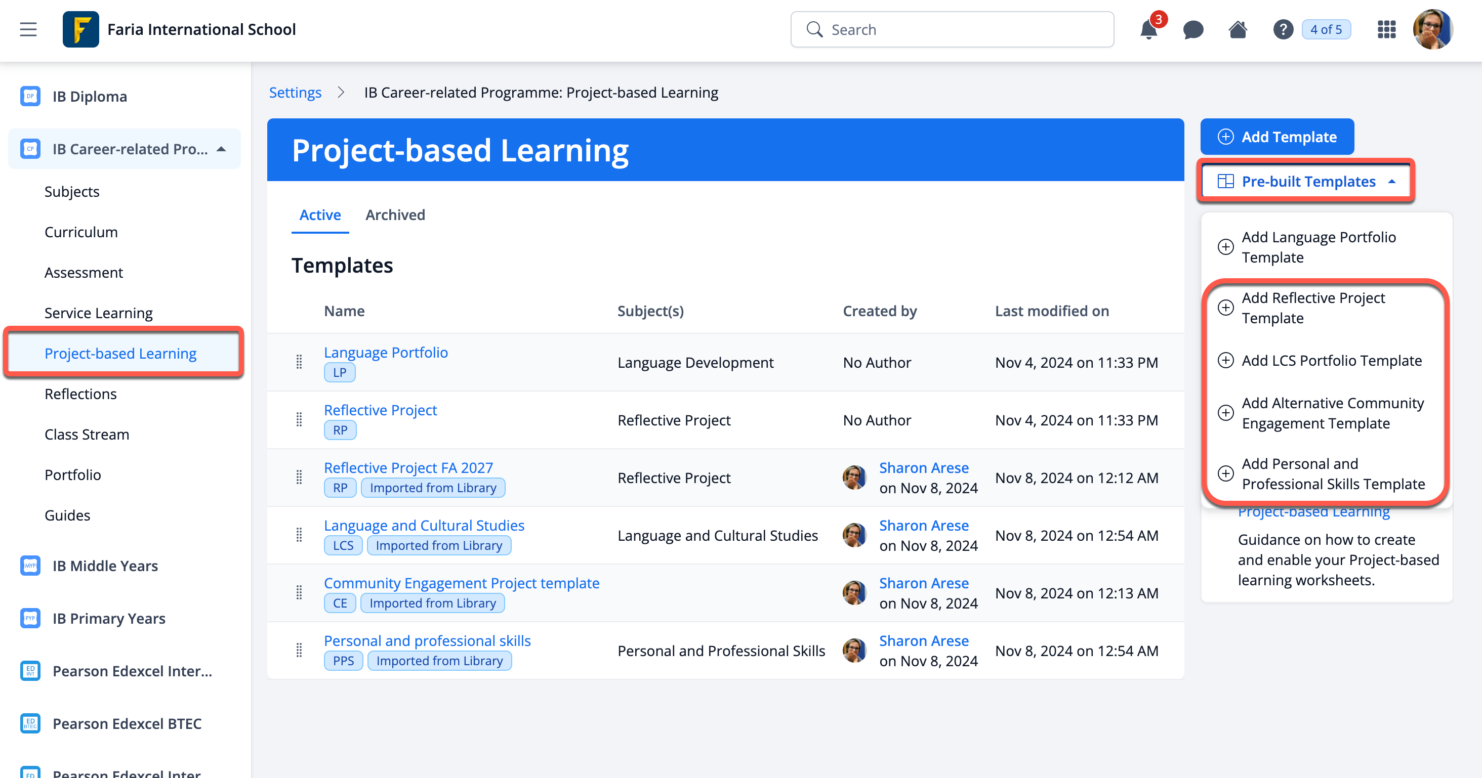 Updated or new Project-based Learning templates are available in the Settings > IB CP > Project-based Learning page via the "Pre-built Templates" menu. These include an updated Reflective Project template and three new templates to be used for first assessment in May 2027 and beyond.